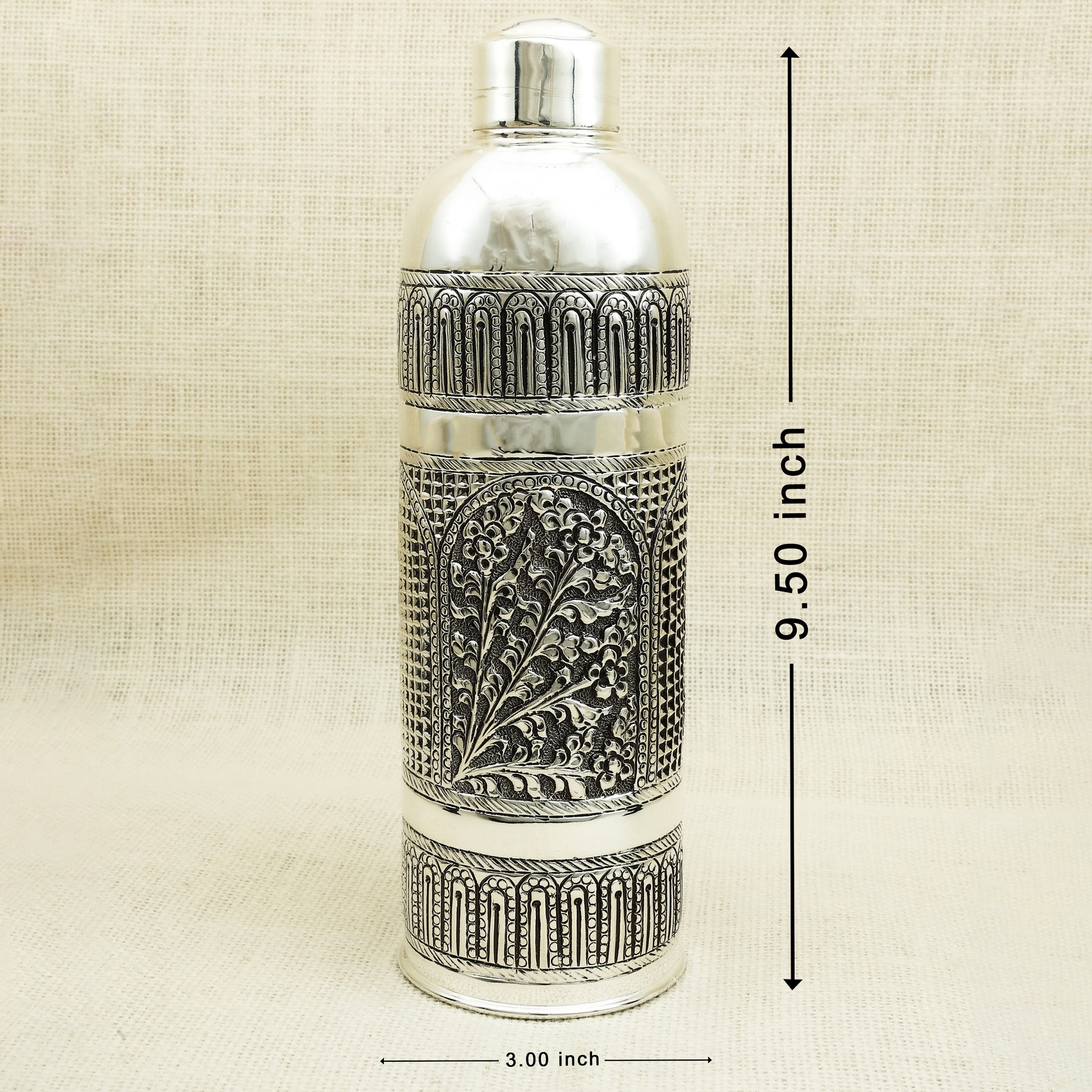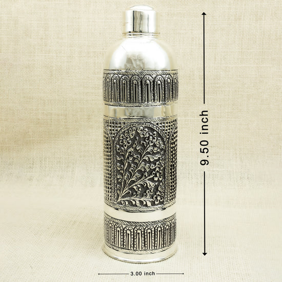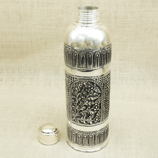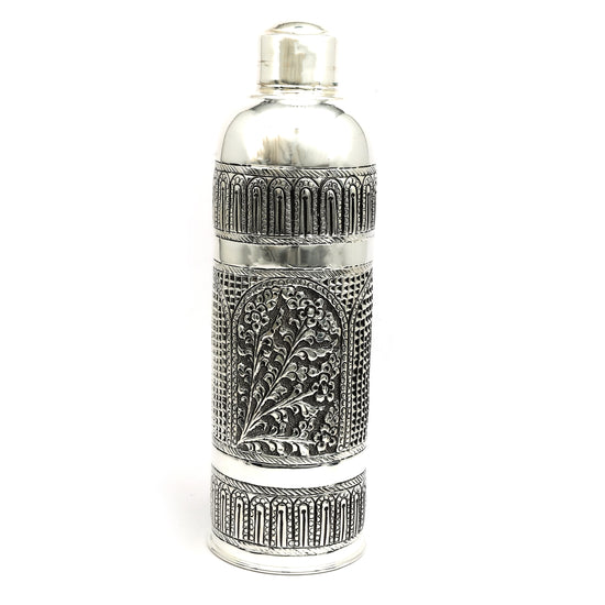 An exquisitely handcrafted silver bottle featuring detailed floral patterns enclosed within arched frames, evoking the grandeur of classical Indian architecture. The antique finish and ornate detailing make this bottle not just functional but also a statement of heritage and elegance. Ideal for storing water with a touch of luxury or as a distinguished décor piece, this silver bottle is a thoughtful gift for weddings, housewarmings, or spiritual occasions.
