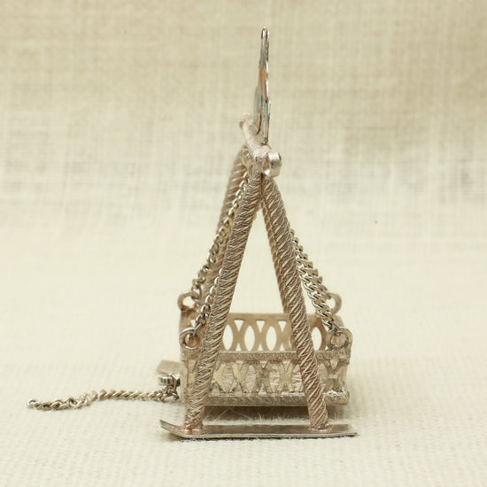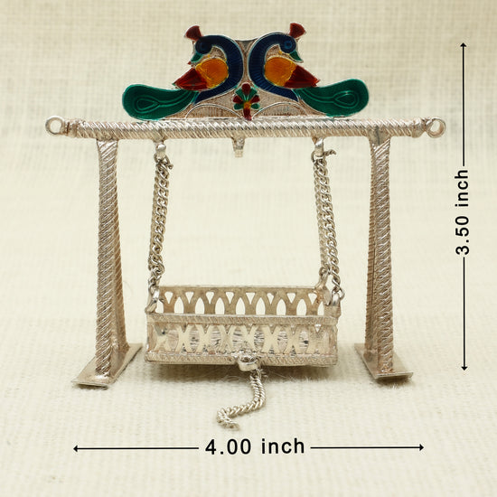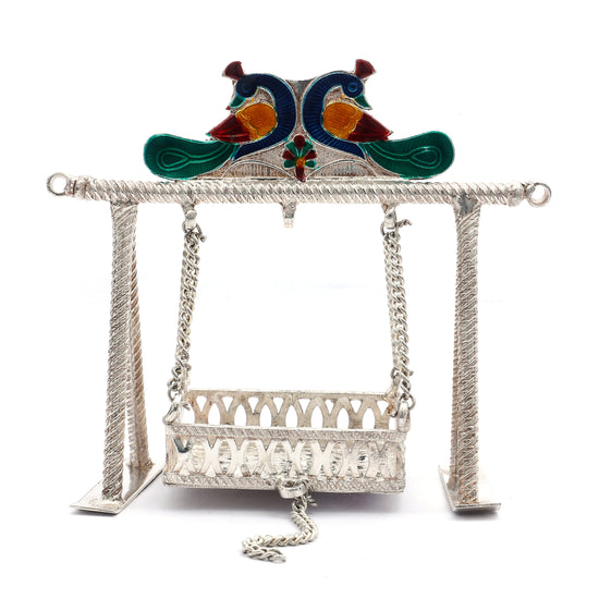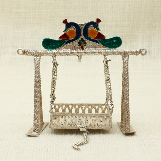 Celebrate divine love and festivity with this charming silver jhoola (cradle), intricately handcrafted and adorned with vibrant enamelled peacocks perched above. Symbolizing grace and beauty, the twin peacocks add a lively touch to this traditionally inspired piece. The swing features delicate filigree work, hanging from finely detailed silver chains that reflect timeless craftsmanship. Perfect for placing small idols during Janmashtami or daily pooja, this jhoola is a spiritual centerpiece and a delightful addition to any sacred setup or festive decor.