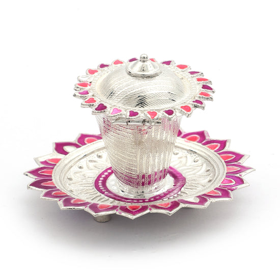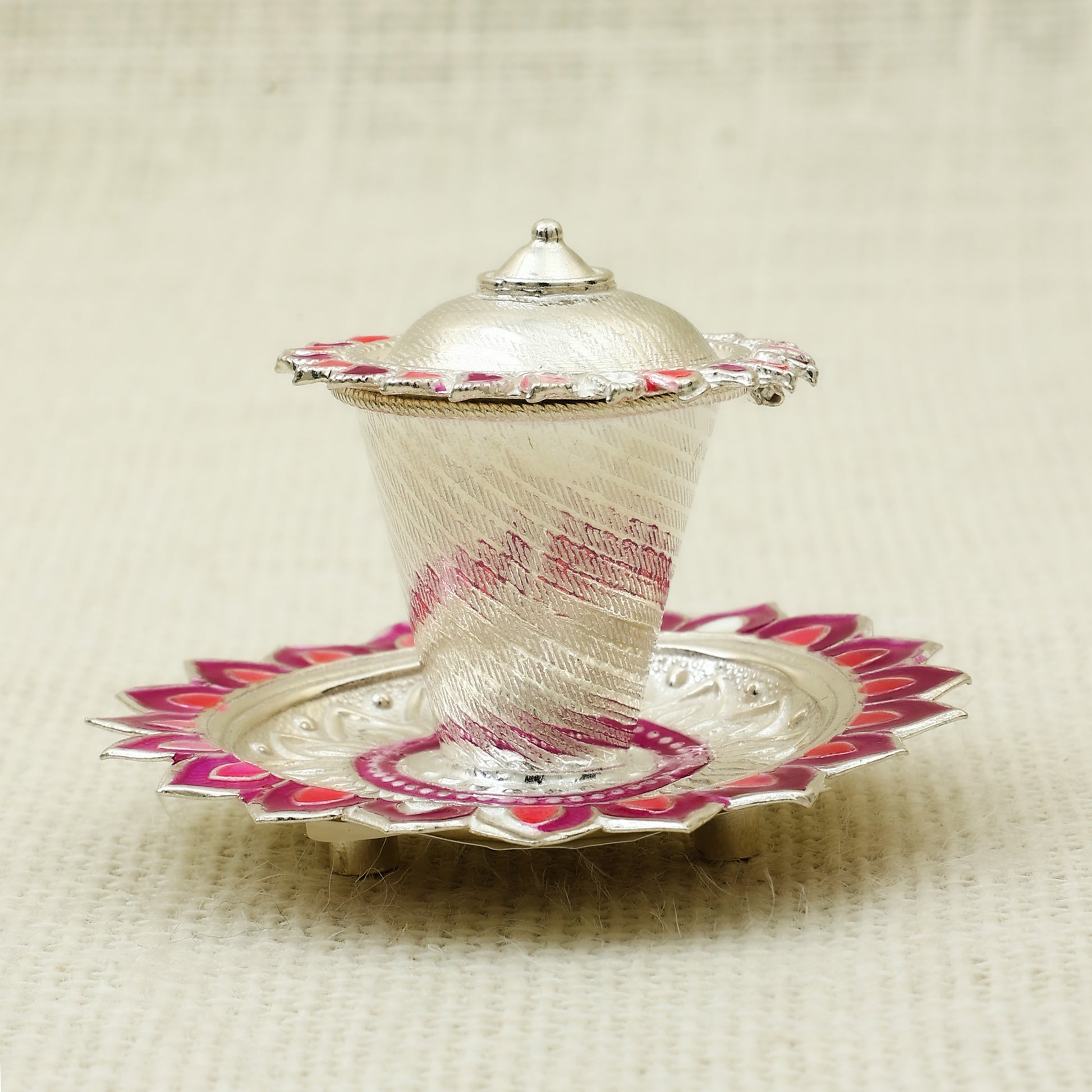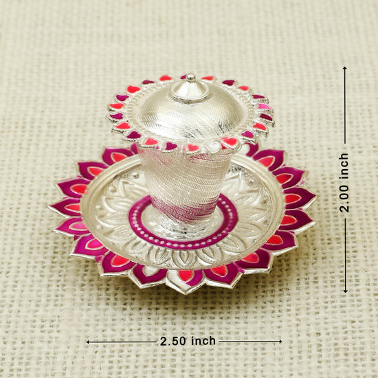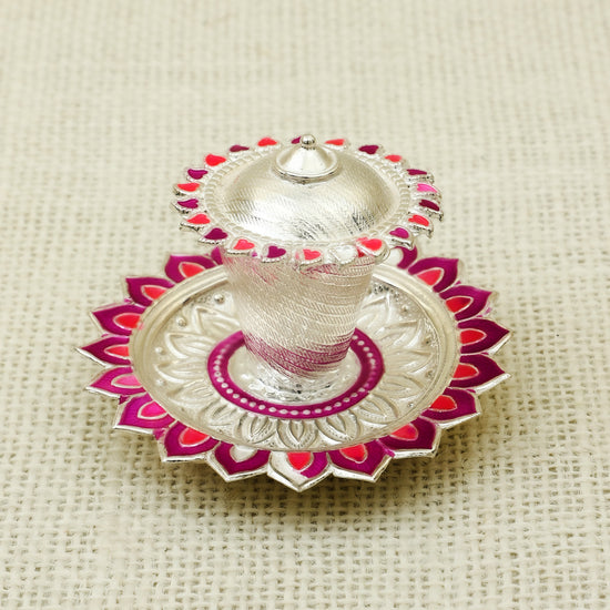 Celebrate tradition with this exquisitely crafted silver Kankavati Meena, adorned with vibrant enamel work and a blooming lotus base. Traditionally used to hold kumkum or haldi during auspicious rituals, this piece combines the elegance of antique silver with intricate Meenakari accents in rich shades of pink and red. The delicate lid and ornate petal-edged base make it perfect for festive occasions, bridal ceremonies, or pooja decor. A graceful blend of functionality and artistry, ideal for every sacred setting.
