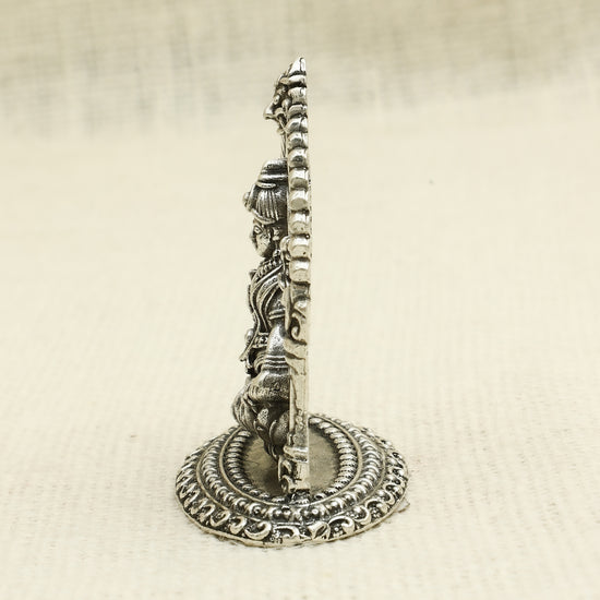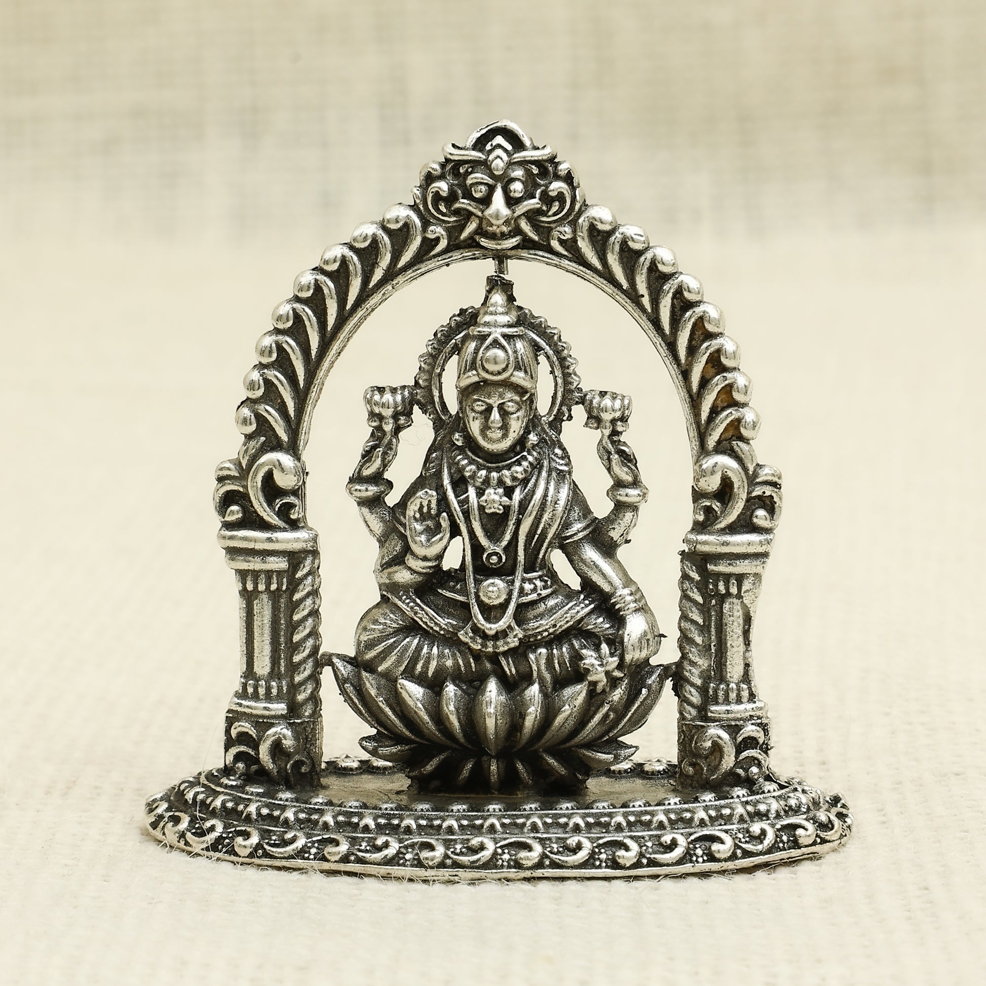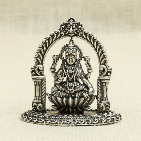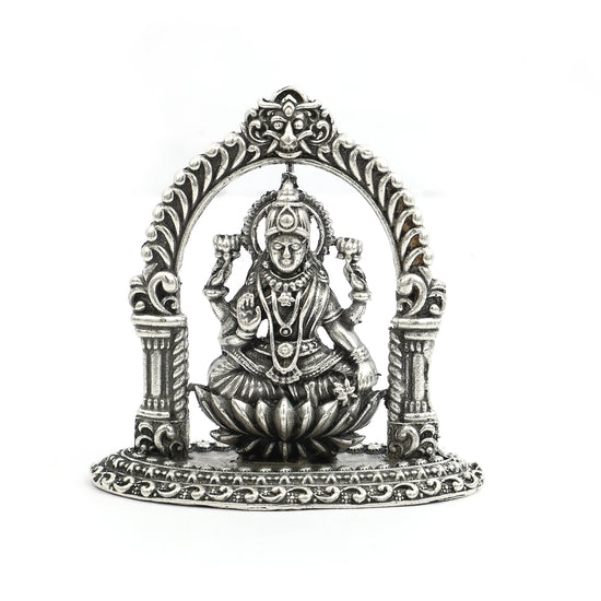 Invite prosperity and grace into your home with this intricately crafted Lakshmi idol in silver. Designed in a traditional style with an antique finish, the goddess is shown seated serenely on a blooming lotus, symbolizing abundance, purity, and spiritual wisdom. Enclosed within a beautifully detailed arch, the piece features fine ornamental work, enhancing its divine presence. Perfect for pooja setups, Diwali decor, or as a thoughtful gift, this idol reflects the timeless beauty and blessings of Goddess Lakshmi. A refined spiritual artefact for your sacred space.
