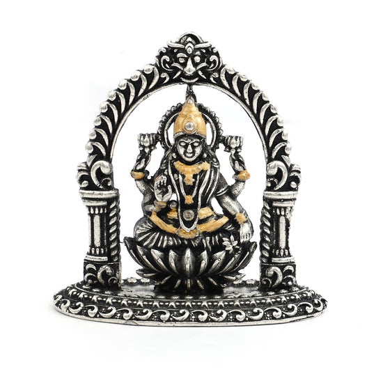 Invite prosperity and blessings into your home with this exquisitely crafted silver-plated Laxmi idol. Depicting the goddess seated gracefully on a lotus and framed by an ornate arch, the idol is accented with subtle golden highlights that enhance its divine charm. Ideal for pooja rooms, festive décor, or gifting during Diwali and religious ceremonies, this sacred piece embodies grace, abundance, and tradition in every detail.