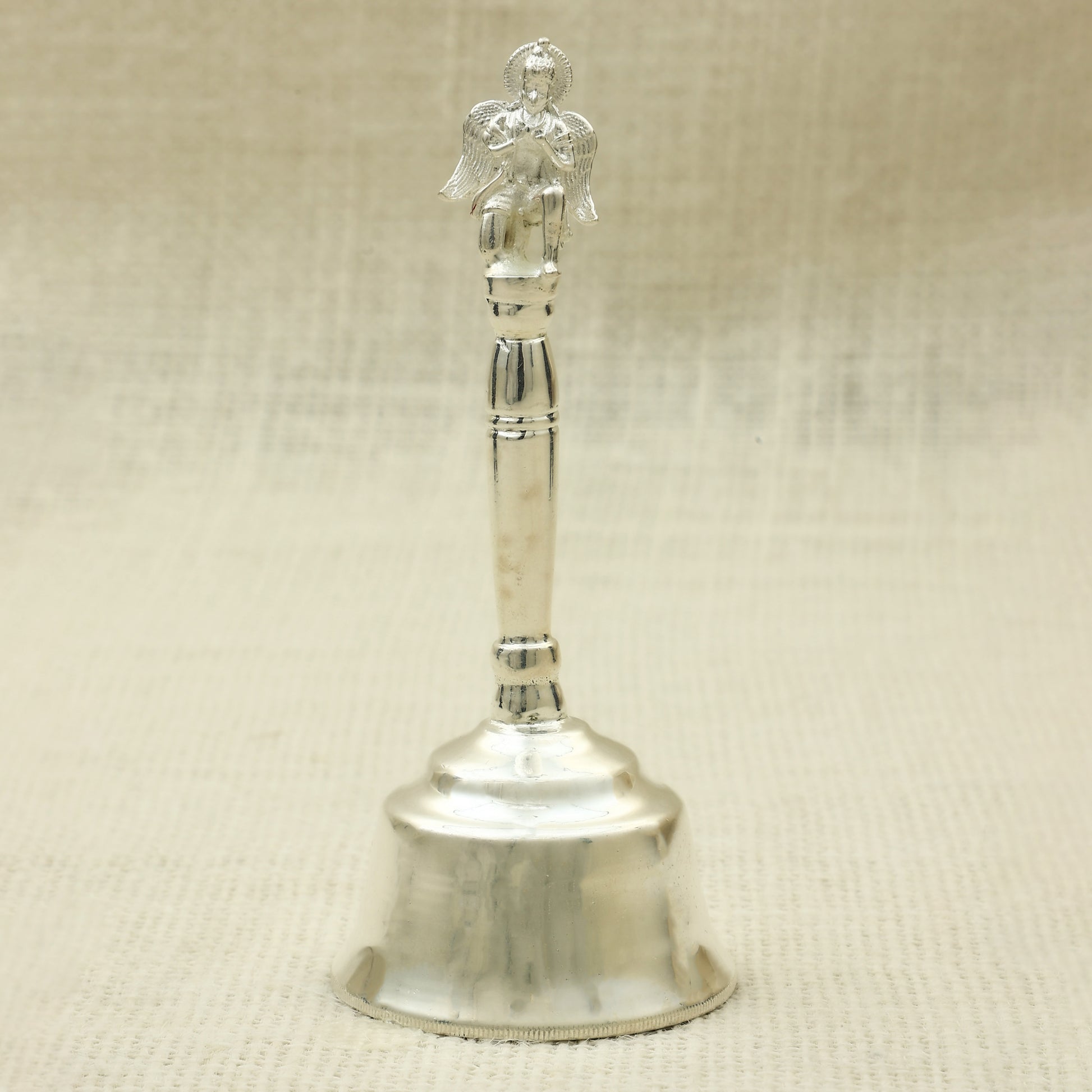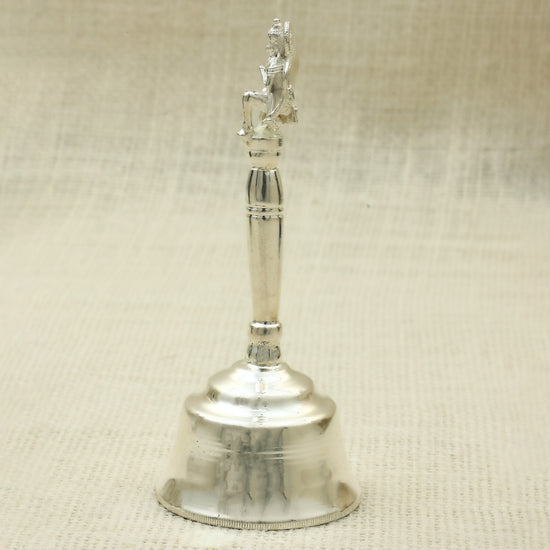 Enhance your spiritual rituals with this finely crafted silver pooja bell, featuring a majestic Garuda figure atop the handle. Known as the divine mount of Lord Vishnu, Garuda symbolizes strength, protection, and unwavering devotion. The bell’s antique finish adds a timeless appeal, while its clear, resonant chime creates an auspicious atmosphere for prayer and meditation. With detailed craftsmanship and a graceful silhouette, this sacred accessory is perfect for daily poojas, temple decor, or as a thoughtful religious gift. A meaningful addition to any devotional space.
