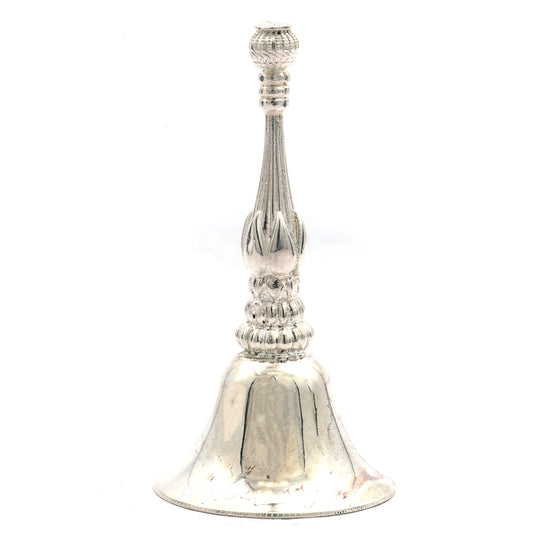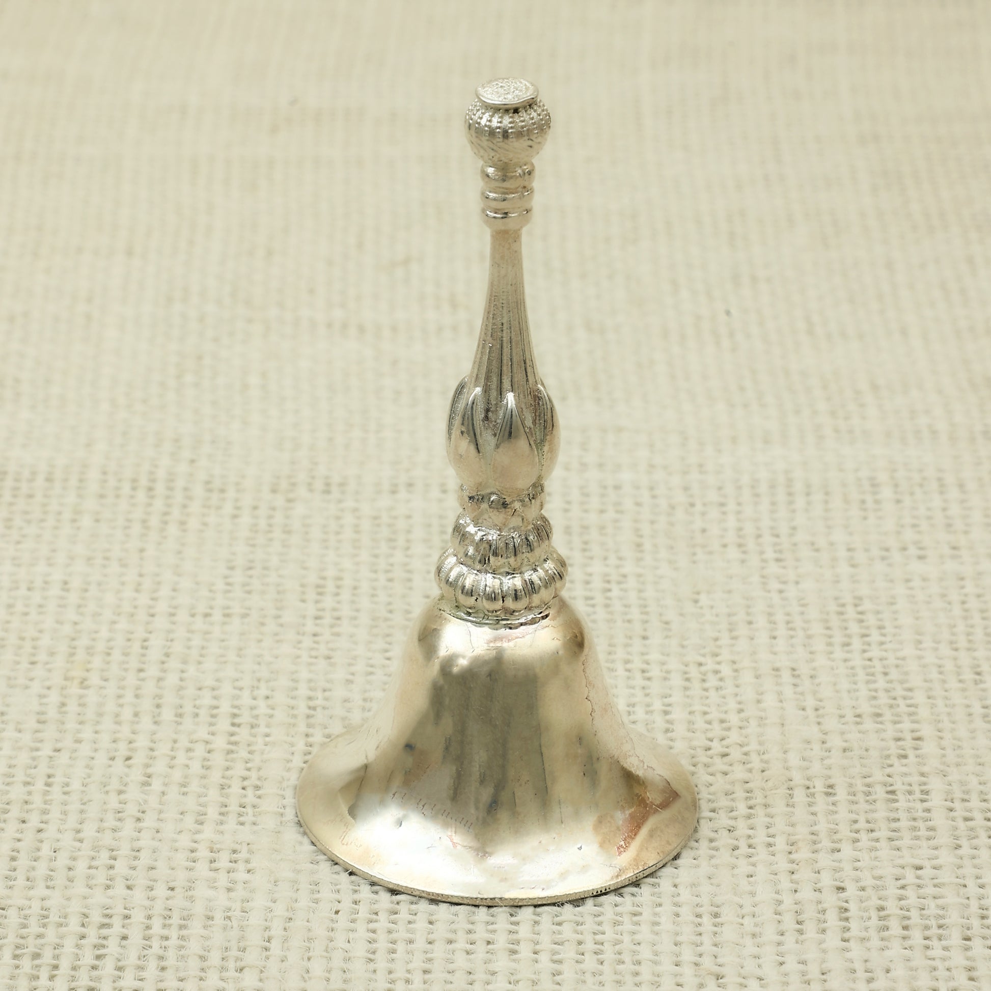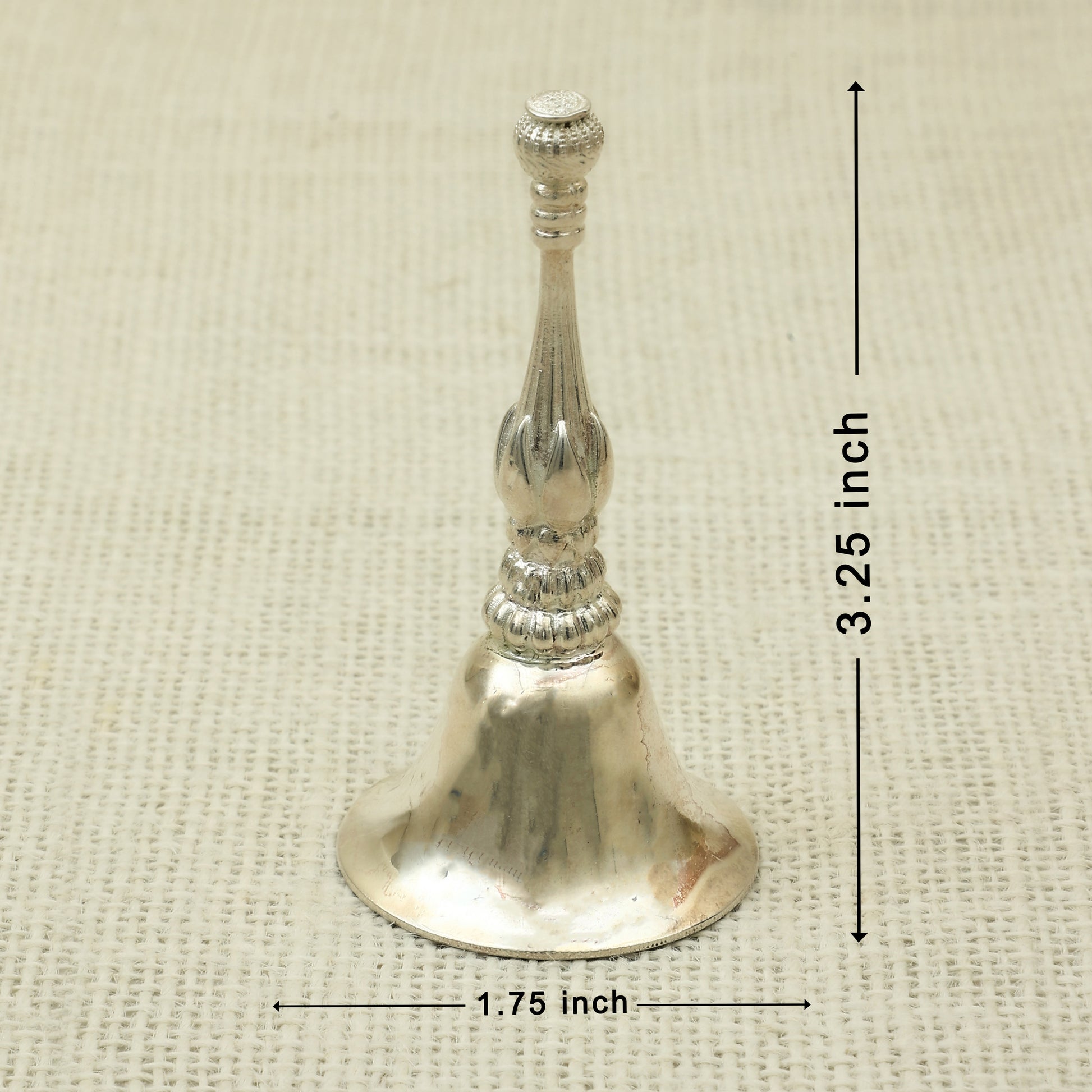 Add a touch of elegance and tradition to your spiritual rituals with this beautifully designed silver pooja bell, featuring an ornate floral-inspired handle and a gently flared base. The antique finish highlights its intricate detailing, offering both visual charm and functional grace. This bell produces a crisp, resonant sound that uplifts the ambience of your pooja or meditation space. Perfect for daily worship, festive ceremonies, or as a sacred gift, it embodies the perfect blend of artistry and devotion.