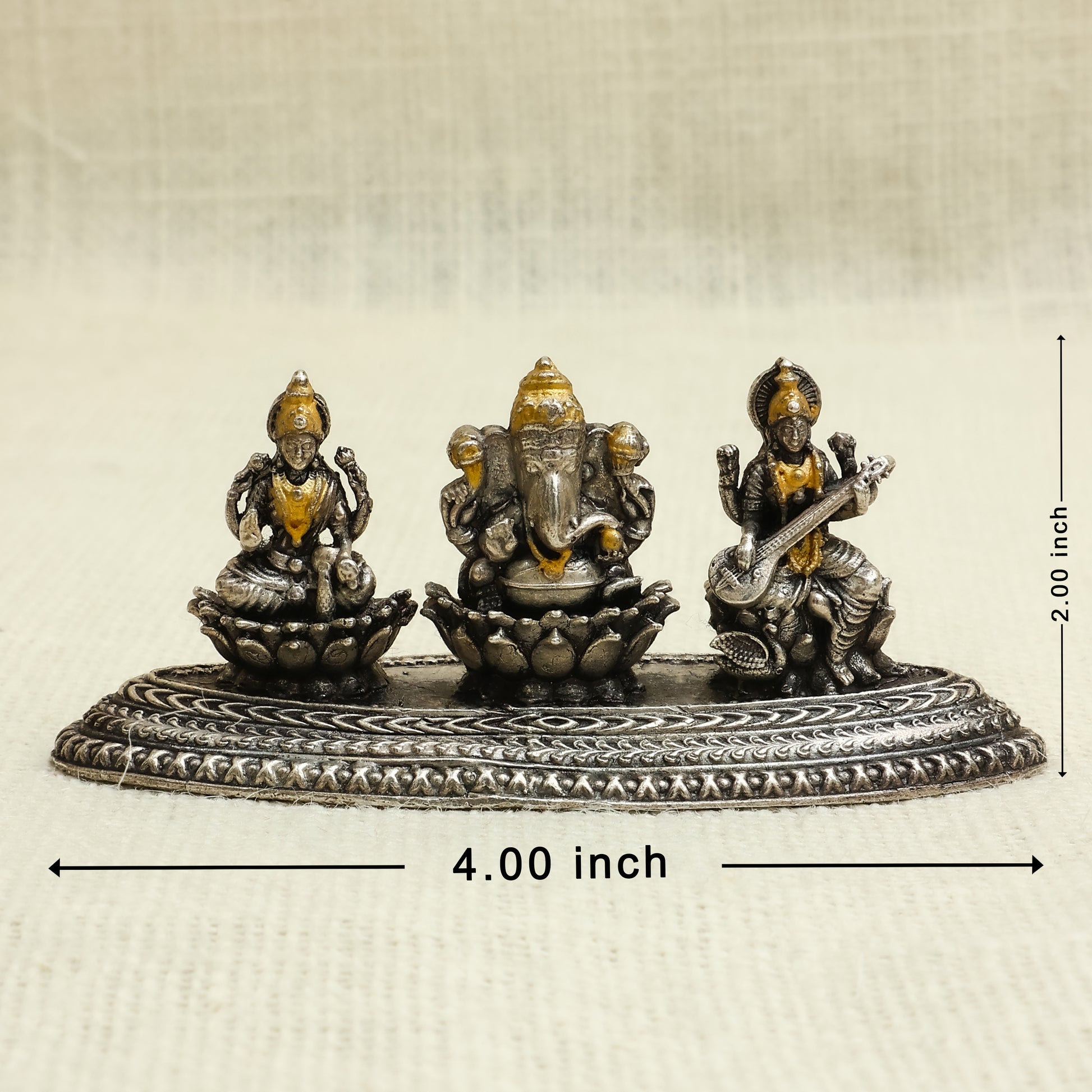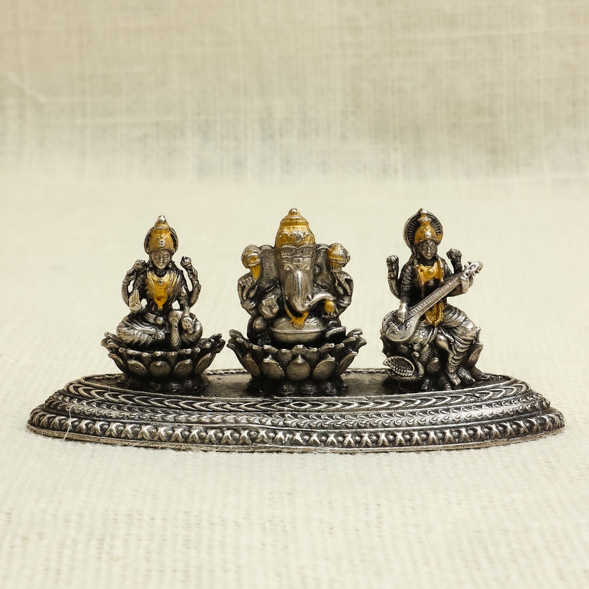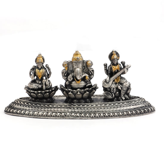 Antique Silver Finish Laxmi Ganesh Saraswati Idol Set – Seated on Lotus Base