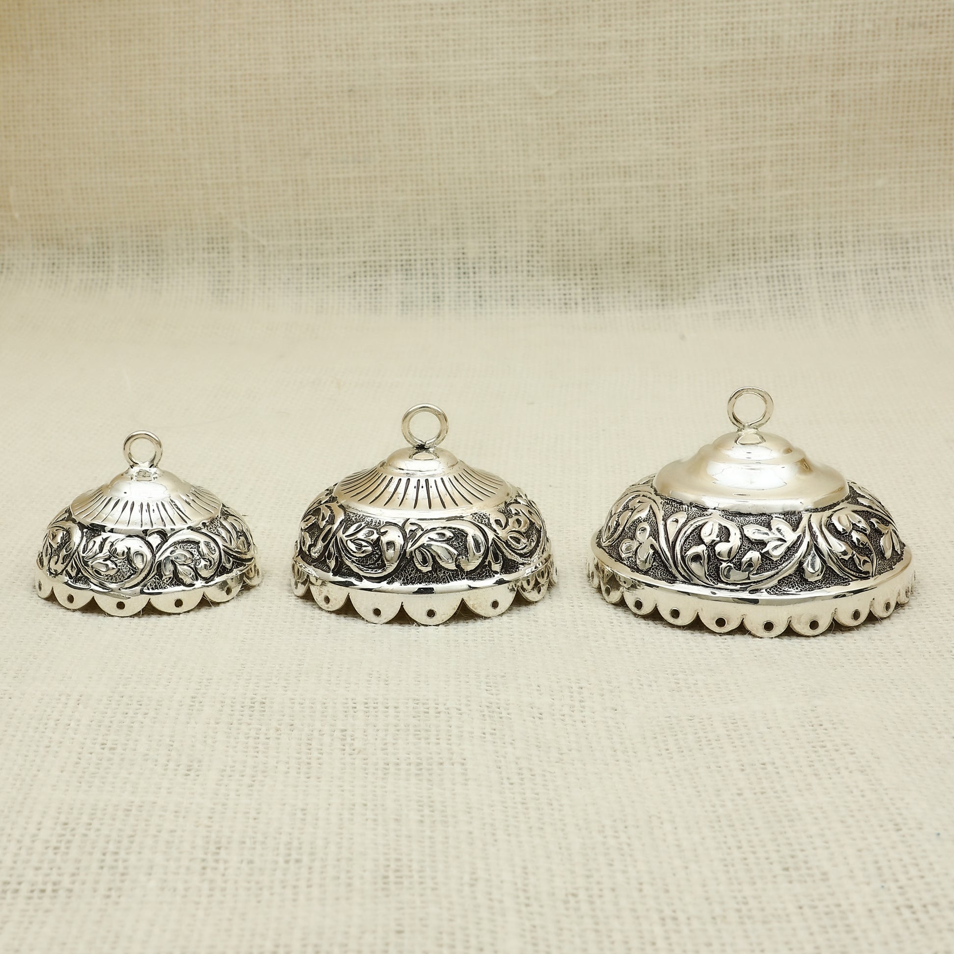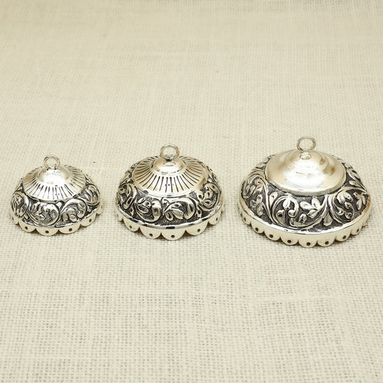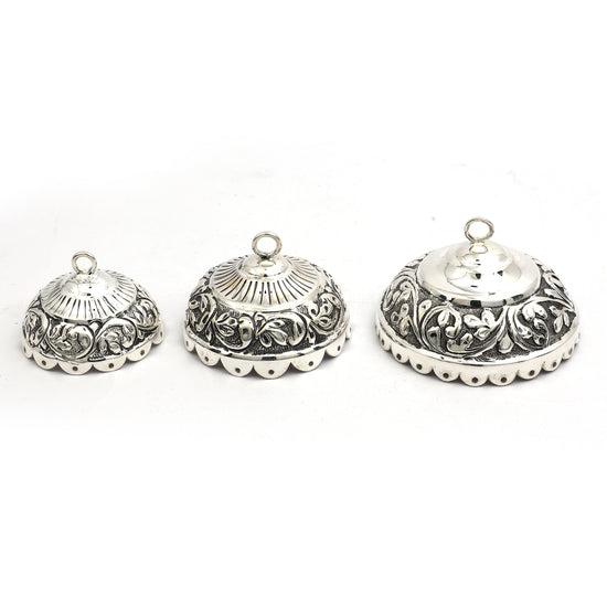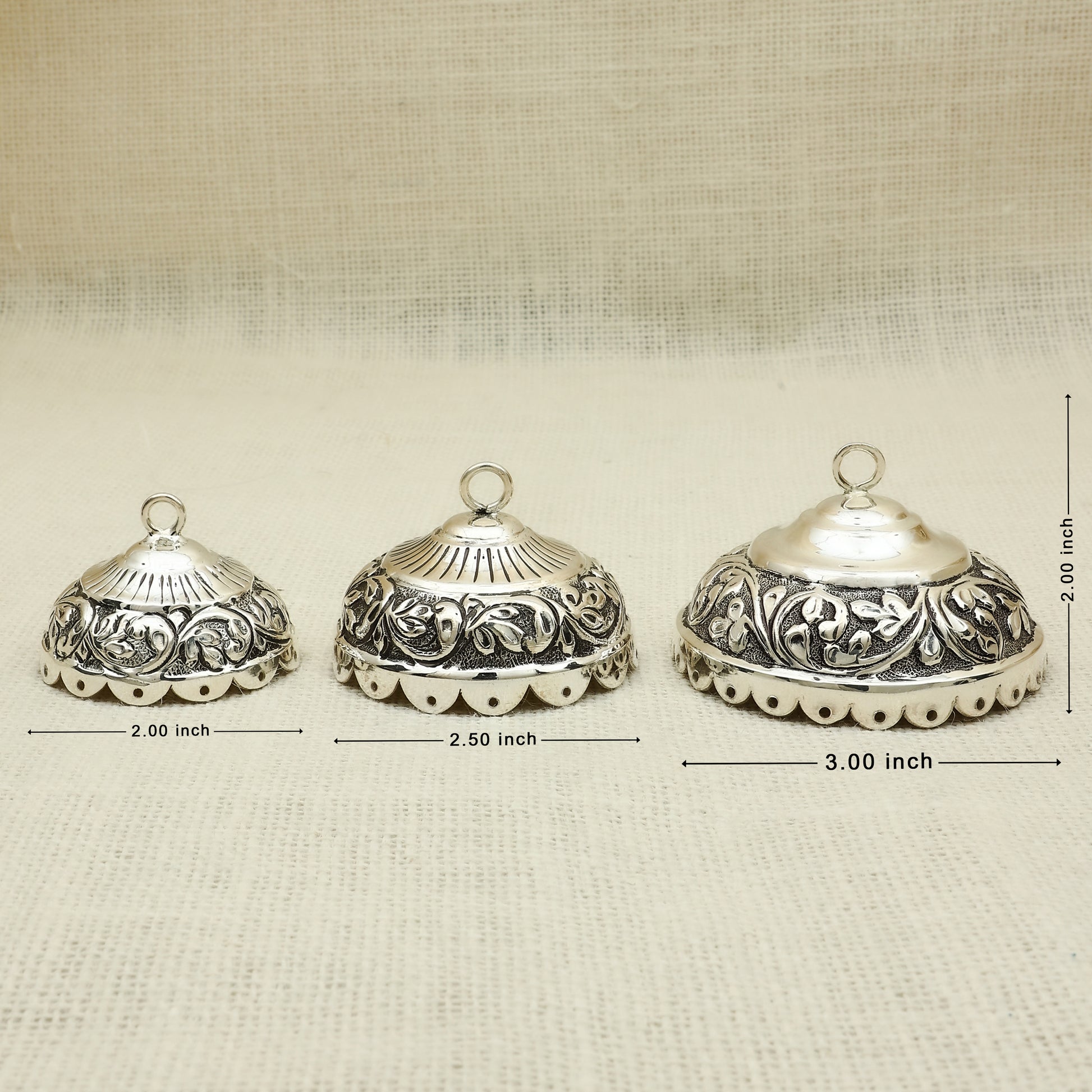 Add a divine touch to your idols and pooja setup with this set of three silver plated umbrella chattars, featuring intricate floral engravings and traditional scalloped edges. Symbolizing honor and reverence, these beautifully crafted chattars are ideal for adorning deity statues during festive rituals, temple décor, or spiritual ceremonies. A perfect blend of devotion and craftsmanship.