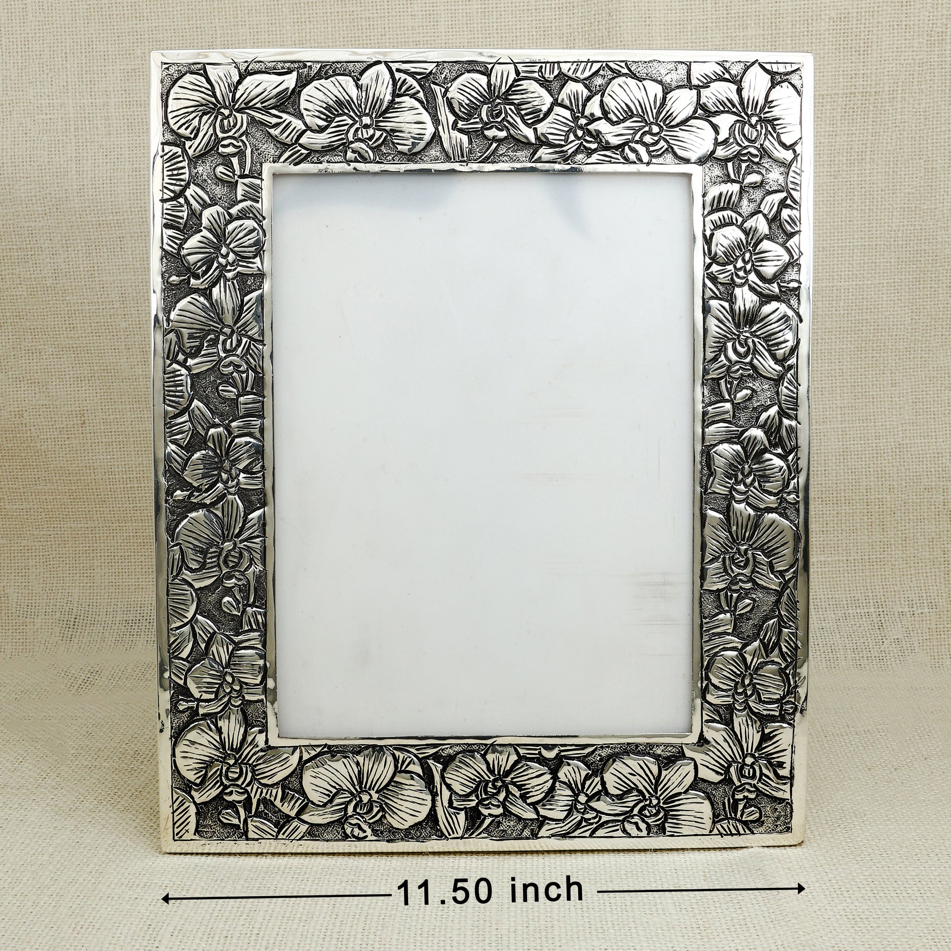 Add a regal touch to your décor with this exquisitely crafted silver photo frame, featuring intricate floral engravings that bring timeless elegance to any space. Designed with a refined silver-toned finish and supported by a sturdy wooden base, this frame is perfect for displaying cherished memories, portraits, or spiritual images. A thoughtful and elegant gift for weddings, anniversaries, or traditional celebrations.