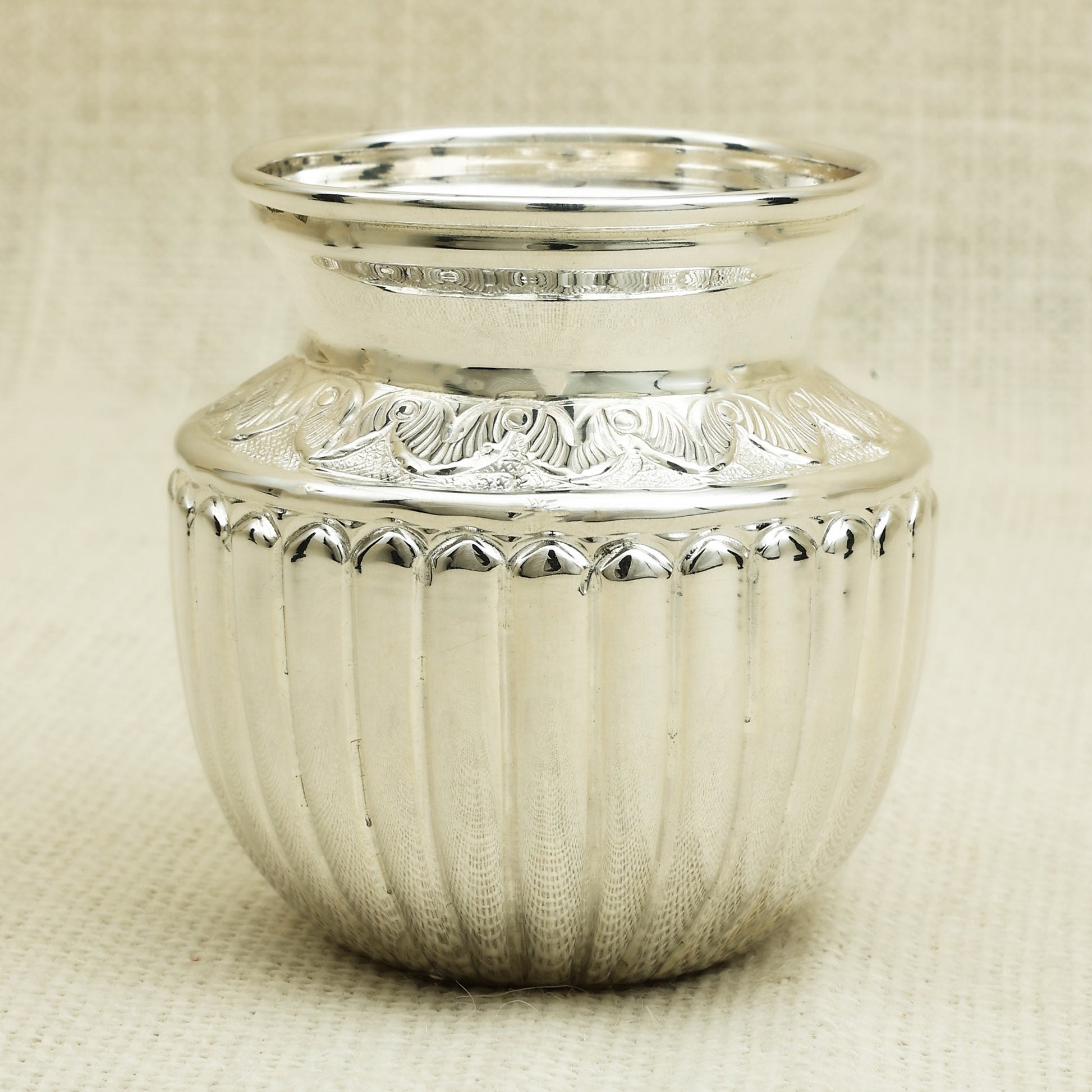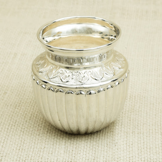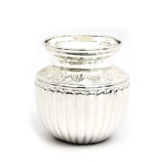 Add a regal touch to your décor with this exquisitely crafted antique silver kalash, featuring a sophisticated vertical ribbed pattern and delicately engraved floral band near the rim. With its polished finish and graceful form, this kalash is perfect for religious rituals, temple use, or festive decorations. A thoughtful and elegant gift for poojas, housewarmings, or traditional celebrations.
