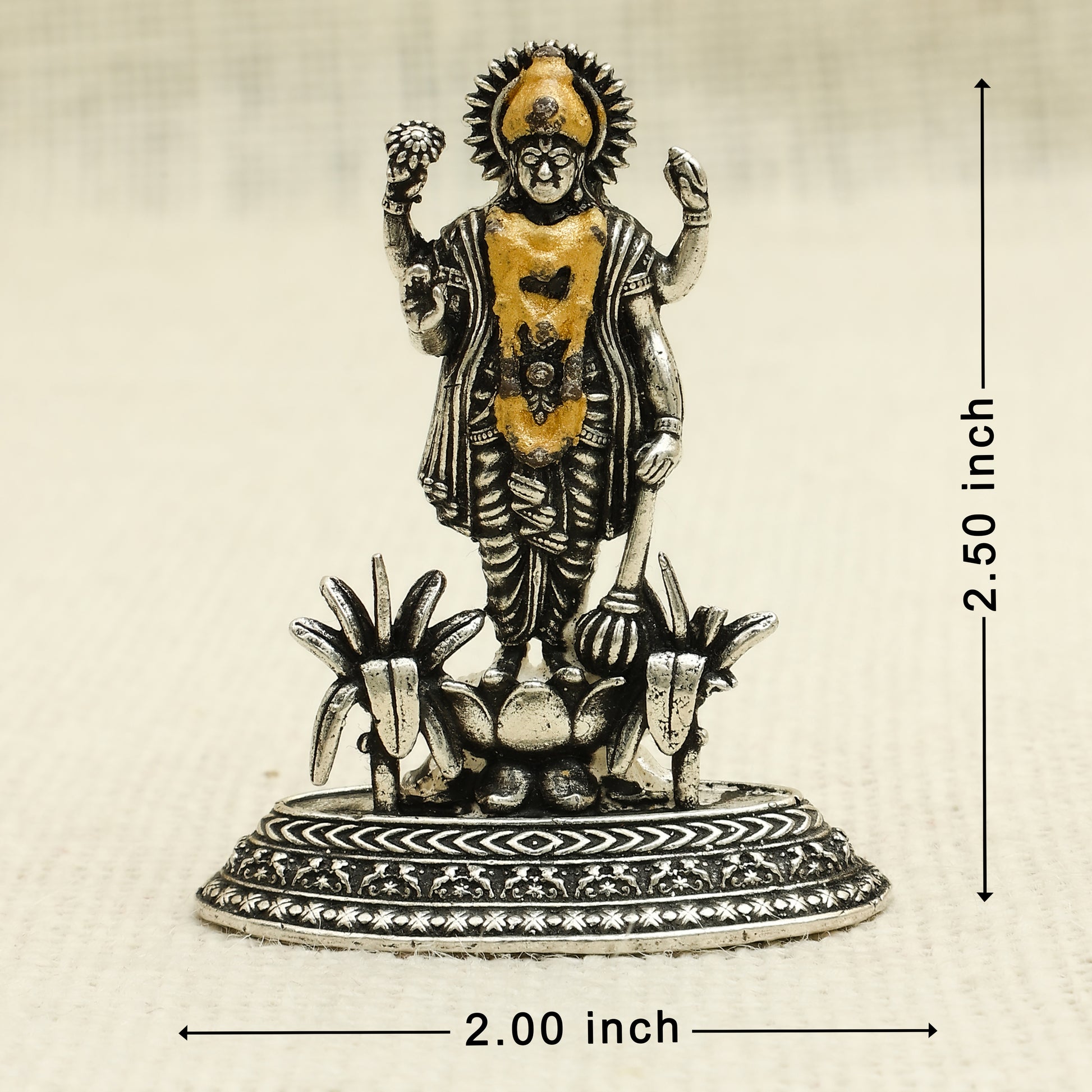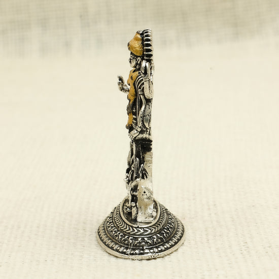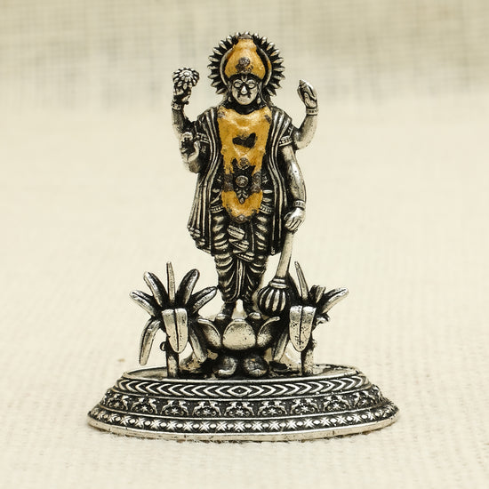 Embrace divine grace and protection with this antique silver idol of Lord Vishnu, standing majestically with his four symbolic arms holding the Shankh, Chakra, Gada, and Padma. Adorned with intricate carvings and subtle gold accents, the idol is a stunning representation of balance, dharma, and cosmic order. Perfect for your altar, meditation space, or as a sacred gift during spiritual celebrations and auspicious occasions.