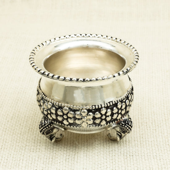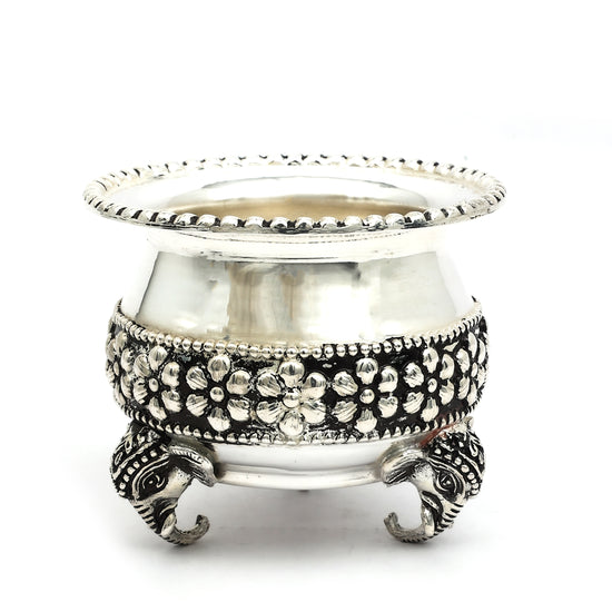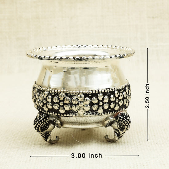 Add a regal touch to your décor with this exquisitely crafted antique silver pot, featuring ornate floral engravings and a bold oxidized finish. Supported by intricately detailed elephant-shaped legs, this piece combines artistry with tradition, making it ideal for pooja rituals, sacred offerings, or as a decorative accent. A thoughtful and elegant gift for housewarmings, festivals, or spiritual ceremonies.