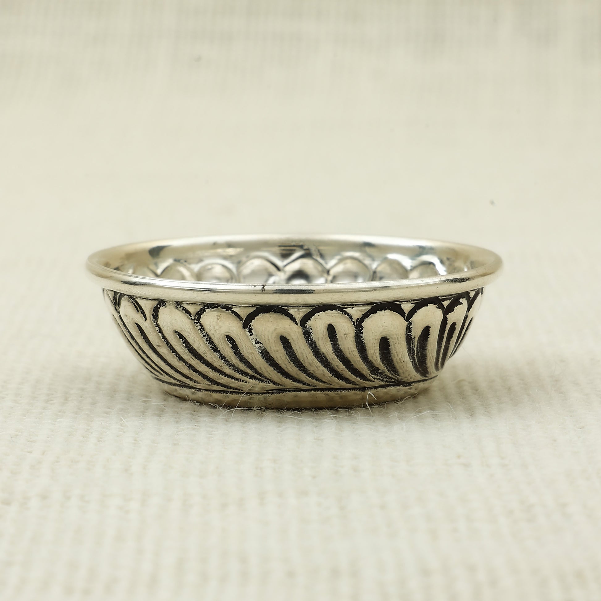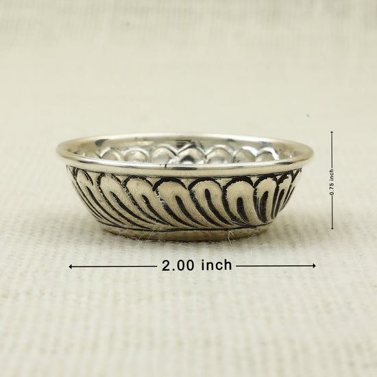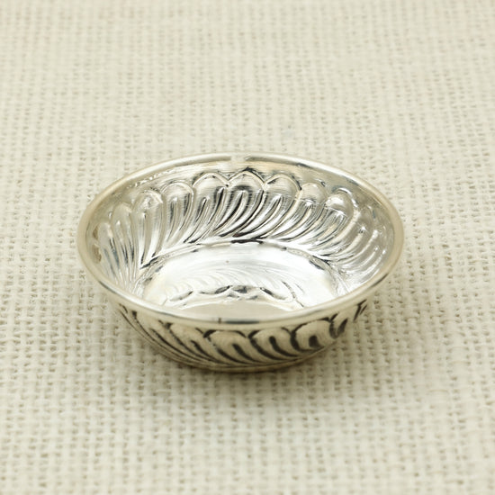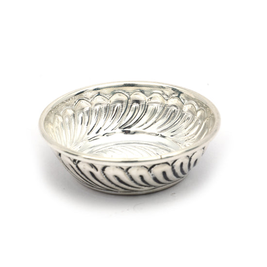 An elegant handcrafted silver bowl adorned with an antique finish and intricate leaf patterns along the outer rim. The design exudes traditional charm, reflecting fine Indian craftsmanship. Ideal for pooja rituals, festive décor, or as a thoughtful gift, this versatile piece can hold kumkum, haldi, or sacred offerings, adding grace and heritage to every spiritual setting.