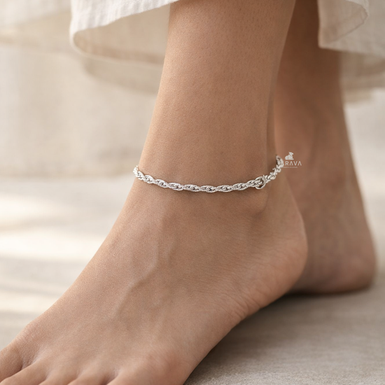 Timeless and refined, the TARAVA Braided Silver Anklet showcases an intricately woven pattern that reflects skilled craftsmanship. Its classic silhouette delivers subtle shine and texture, making it a versatile piece that complements both traditional and contemporary styling.