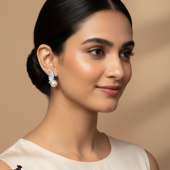 Designed in a graceful butterfly motif, the TARAVA Butterfly Pearl Drop Silver Earrings symbolize beauty, elegance, and transformation. The sparkling zirconia detailing, paired with a rich blue accent and soft pearl drop, creates a refined yet eye-catching design suitable for everyday wear as well as special occasions.