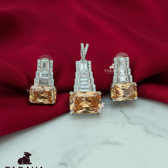 Champagne Rectangle CZ Silver Pendant with Earrings Set