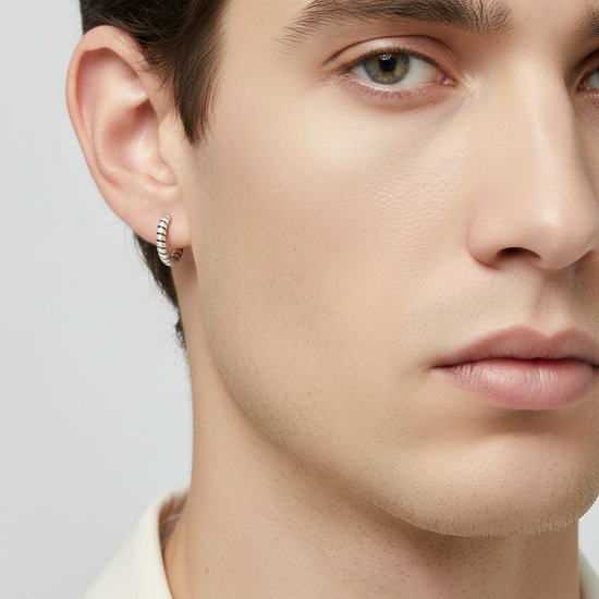 Designed with a minimal yet masculine appeal, this silver earring showcases a sleek ribbed pattern that adds subtle texture without overpowering the look. Its compact size and secure fit make it ideal for everyday wear, offering a modern edge while maintaining timeless simplicity.