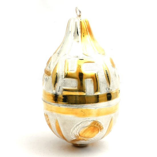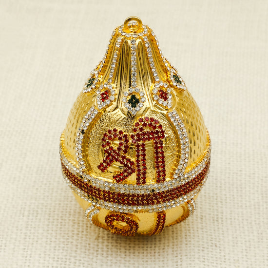 Enhance the spiritual aura of your pooja rituals with this stunning decorative golden nariyal, richly adorned with sparkling stones and the sacred "Shree" symbol in vibrant red. Crafted to resemble a traditional coconut used in Hindu ceremonies, this ornate piece is ideal for temple offerings, festive décor, and gifting on auspicious occasions like weddings, Diwali, and griha pravesh.