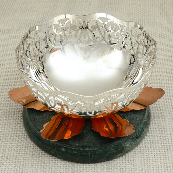 Designer Silver Filigree Bowl with Copper Lotus Base – Mounted on Green Marble