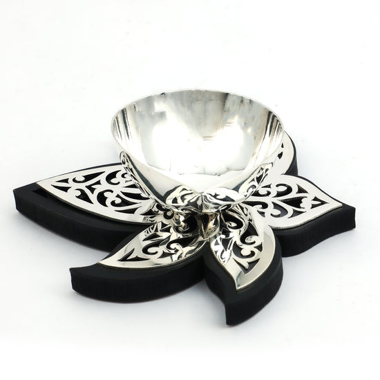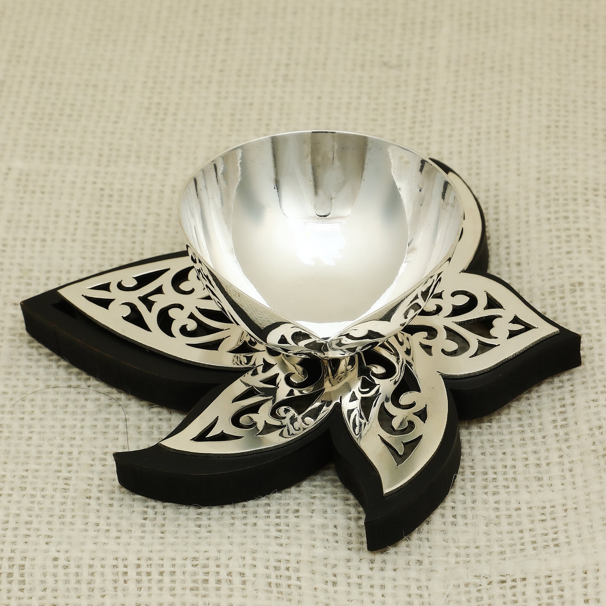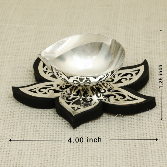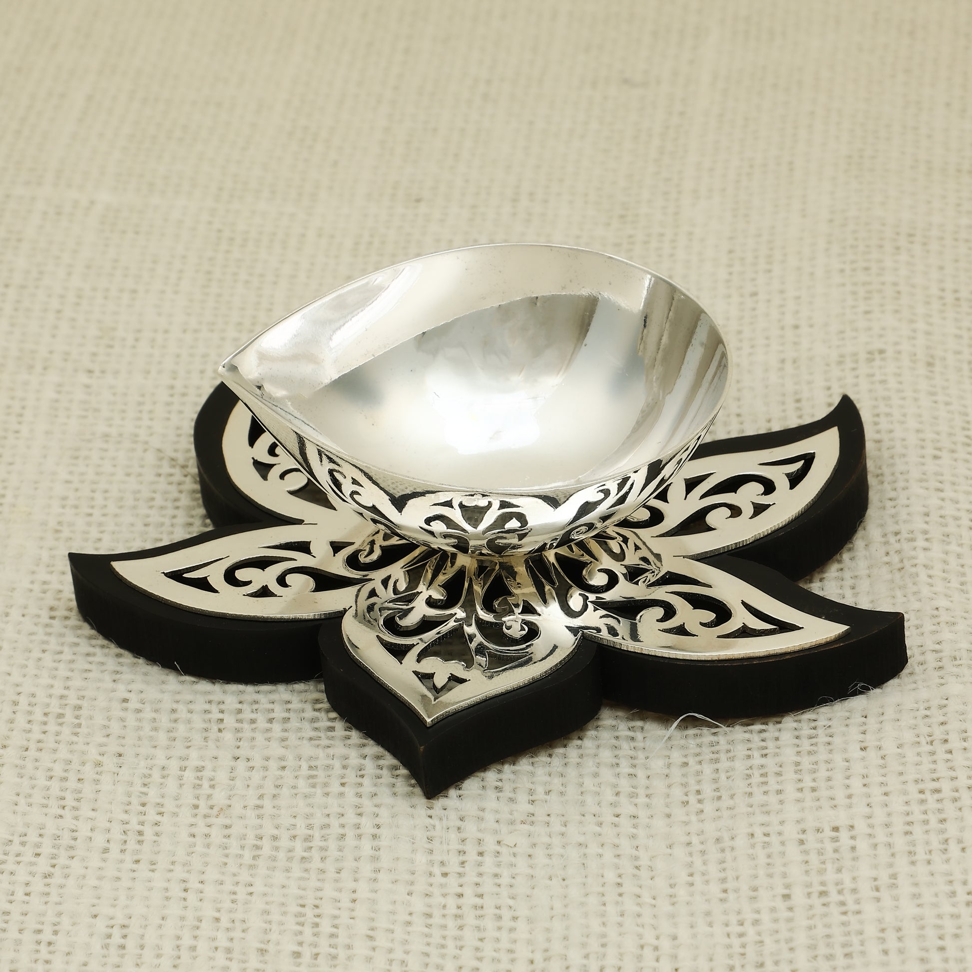 Designer Silver Lotus Diya – Intricate Cutwork on Wooden Base