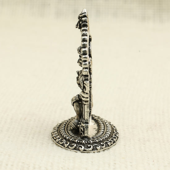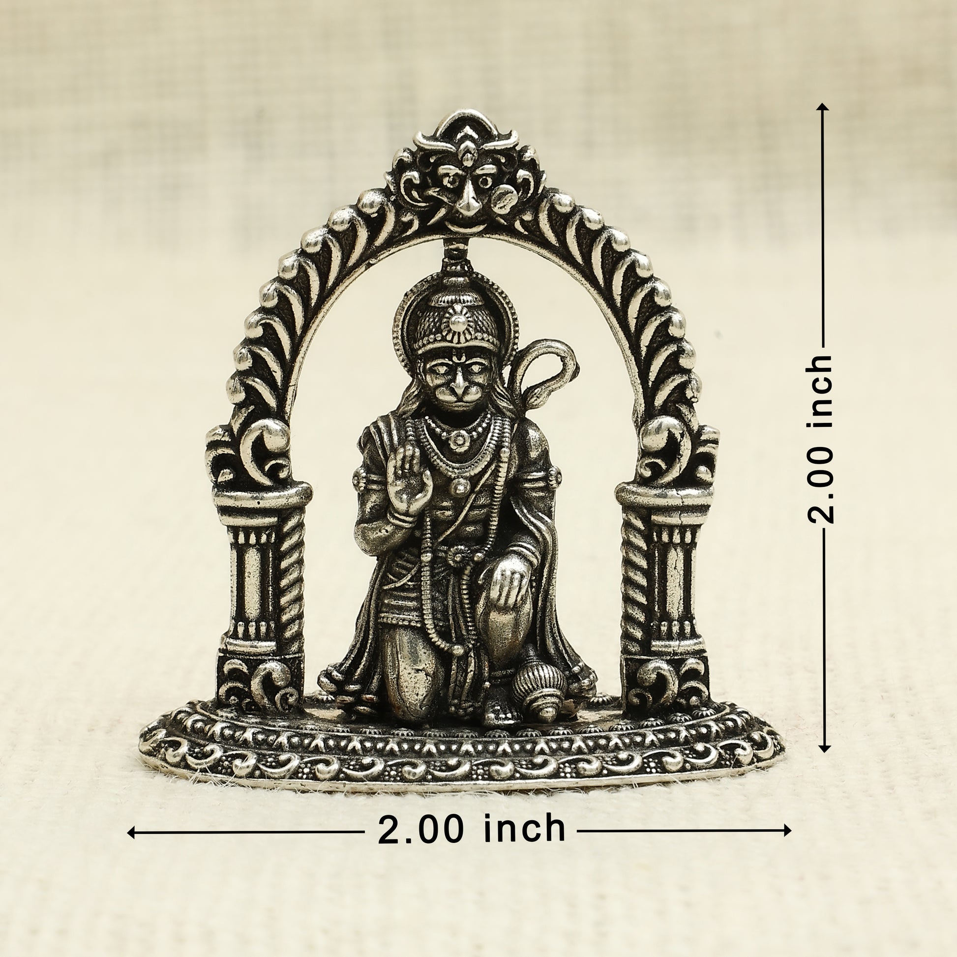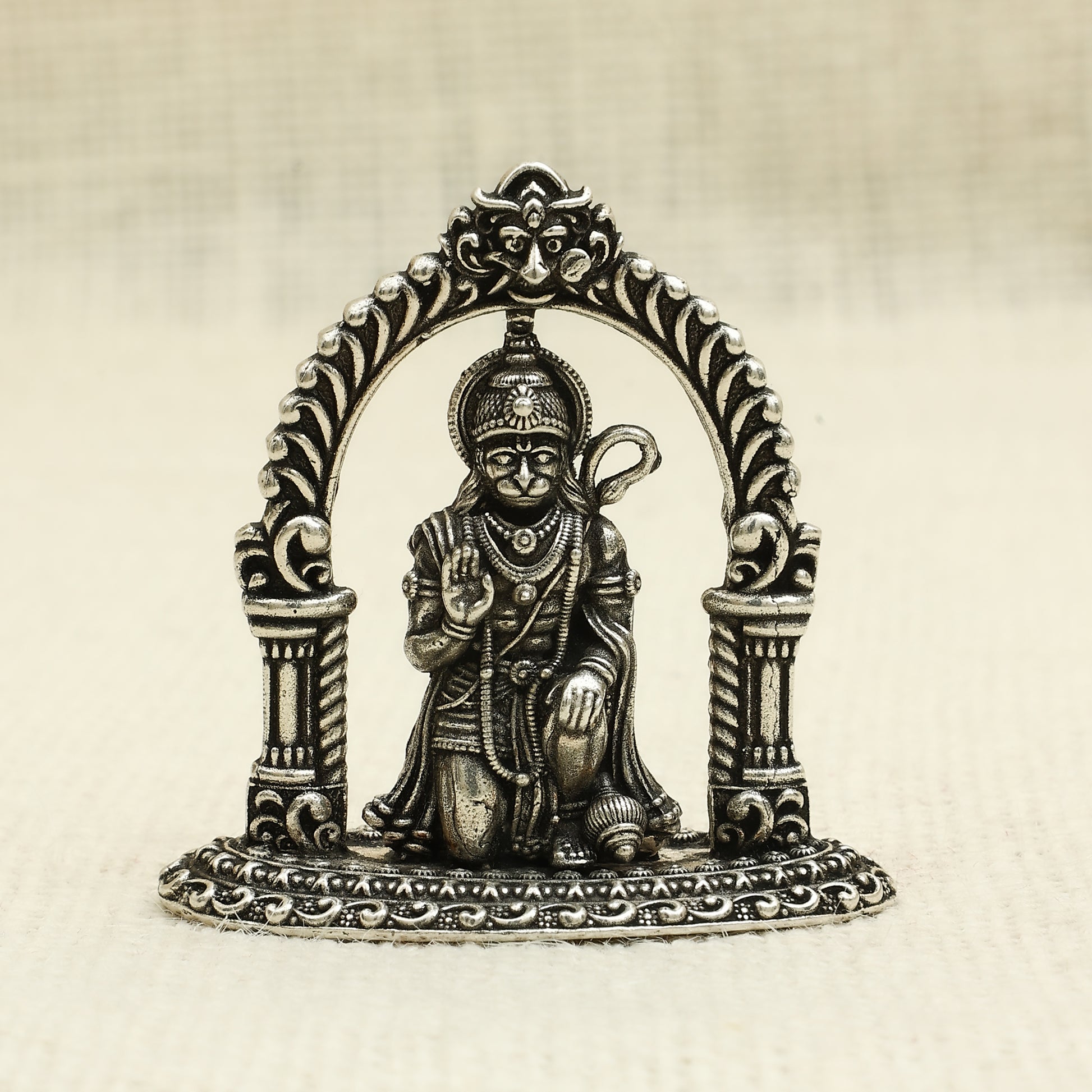 Embrace strength, devotion, and protection with this intricately crafted silver idol of Lord Hanuman, depicted in a kneeling pose with his right hand raised in blessing. Framed by a beautifully detailed arch adorned with floral motifs and ornate columns, this idol captures the divine presence and valor of Bajrangbali. Every element—from the facial features to the attire and weapon—is finely sculpted, reflecting exceptional craftsmanship. Ideal for home altars, spiritual décor, or gifting during religious occasions, this idol invokes divine energy and unwavering devotion.