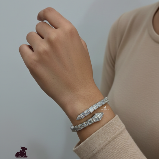 Made from pure 925 sterling silver, this open kada is accented with finely set CZ stones and finished with a high-gloss rhodium coating to resist tarnish.