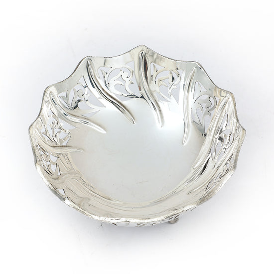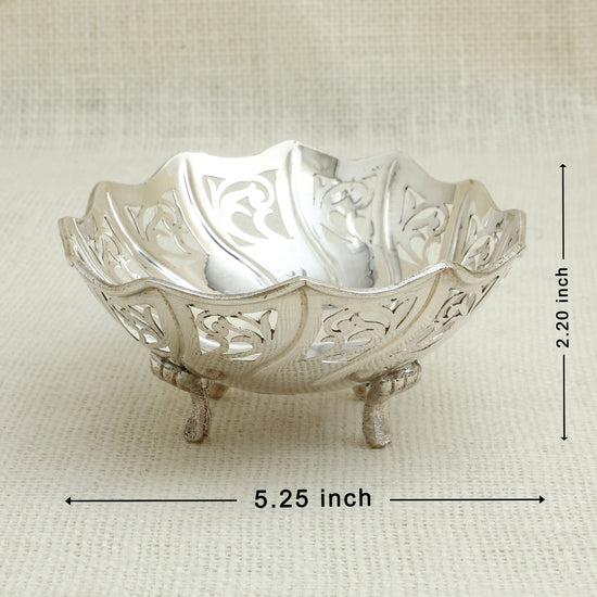 Crafted in fine silver, this decorative bowl stands out with its intricate cutwork pattern and curved rim. Elevated on three ornate legs, it offers both beauty and stability, making it ideal for holding sweets, dry fruits, or simply as a striking centerpiece. A graceful blend of traditional artistry and modern elegance.