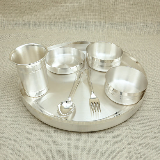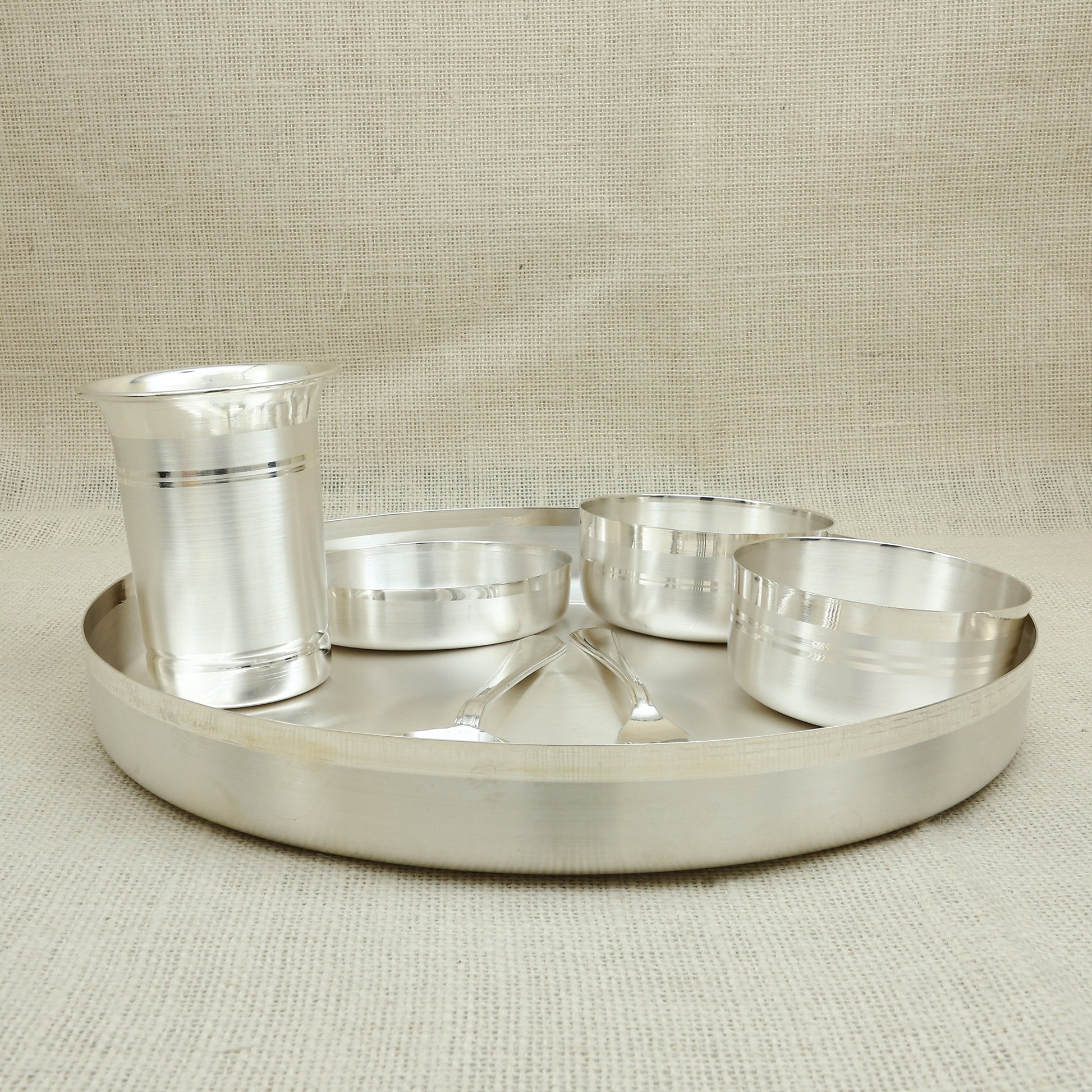 Elevate your dining experience with this elegant silver dinner thali set, featuring a beautifully polished round plate accompanied by three serving bowls, a tumbler, and two matching spoons. Expertly crafted with a smooth, lustrous finish, each element of the set reflects timeless tradition and refined simplicity. Ideal for festive meals, religious offerings, or gifting on special occasions, this classic set is perfect for showcasing Indian hospitality. A cherished addition to any household, it brings grace and cultural charm to every dining ritual.