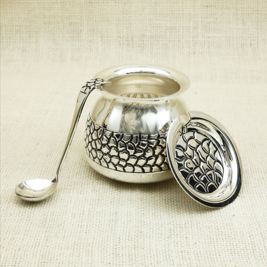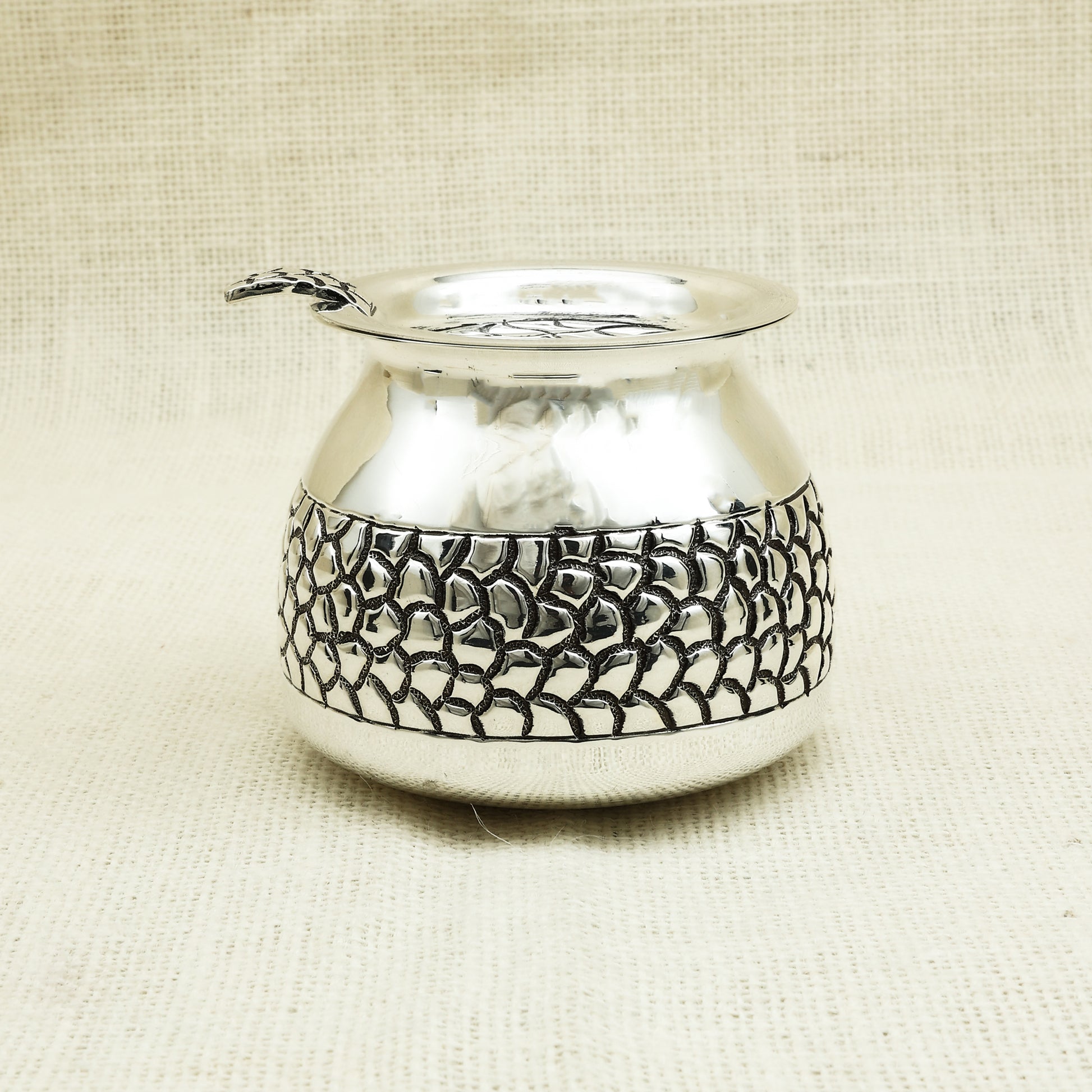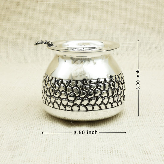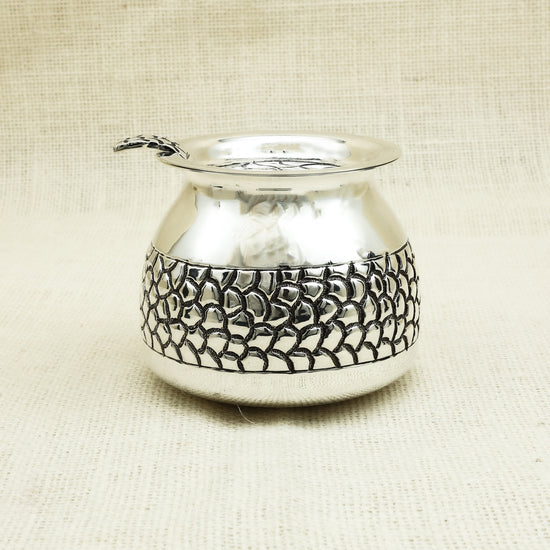 Add a regal touch to your décor with this exquisitely crafted silver kalash, featuring intricate leaf-pattern engravings and a smooth polished finish. Designed in a traditional form with a wide mouth and rounded base, it includes a matching spoon for added utility during rituals. Ideal for storing sacred water or offerings, this kalash is a thoughtful and elegant gift for poojas, housewarmings, or festive celebrations.
