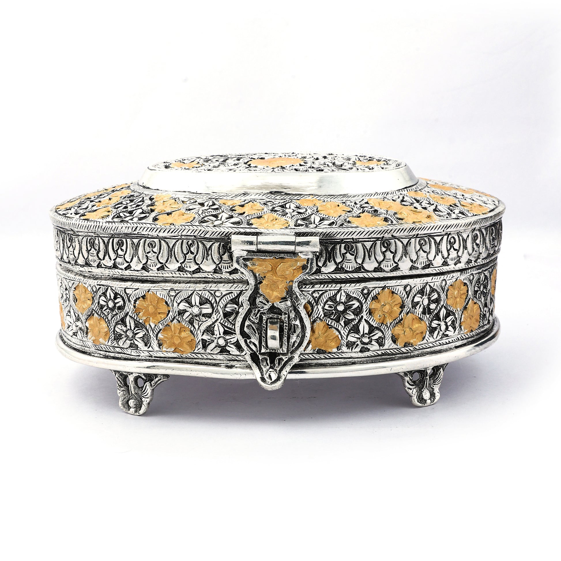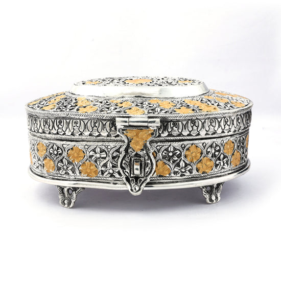 Enhance your home with this exquisite silver dry fruit box, adorned with delicate gold-toned floral patterns. Featuring an antique finish, secure latch, and sturdy legs, this masterpiece blends traditional craftsmanship with timeless elegance. Perfect for storing dry fruits, sweets, or jewelry, it makes an ideal gift for special occasions, festivals, or housewarming ceremonies.