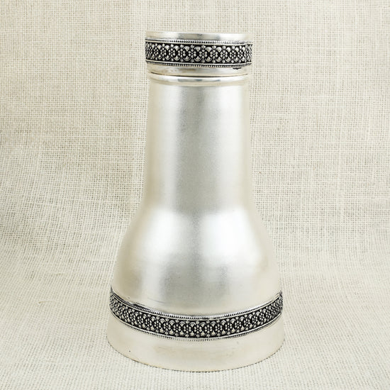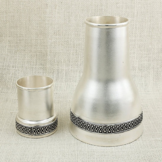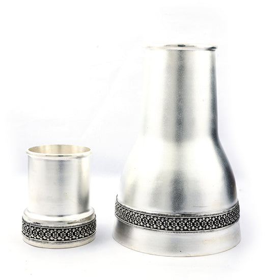 Experience the beauty of simplicity with this finely crafted silver water jug and glass set. Featuring a smooth matte finish with a delicate handcrafted border, this set embodies sophistication and timeless elegance. Designed for both functionality and style, it is a perfect addition to your dining collection, making every sip feel luxurious. Ideal for home use, gifting, or special occasions.
