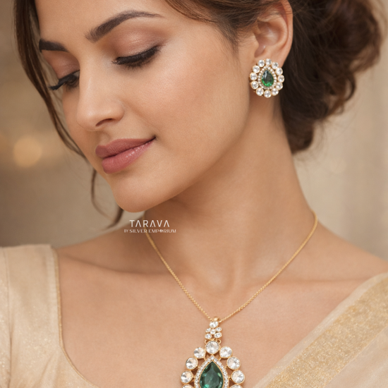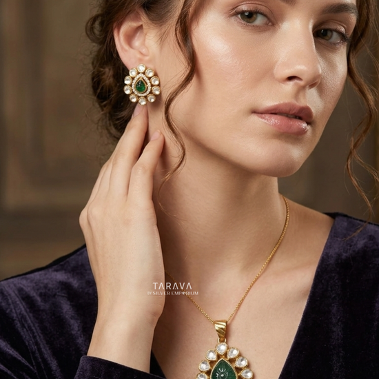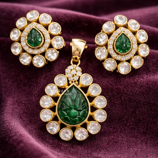 A timeless design showcasing a carved emerald-green teardrop centerpiece surrounded by luminous polki stones arranged in a floral halo pattern. The matching earrings complete the traditional aesthetic, making it a graceful addition to any ethnic jewellery collection.