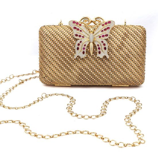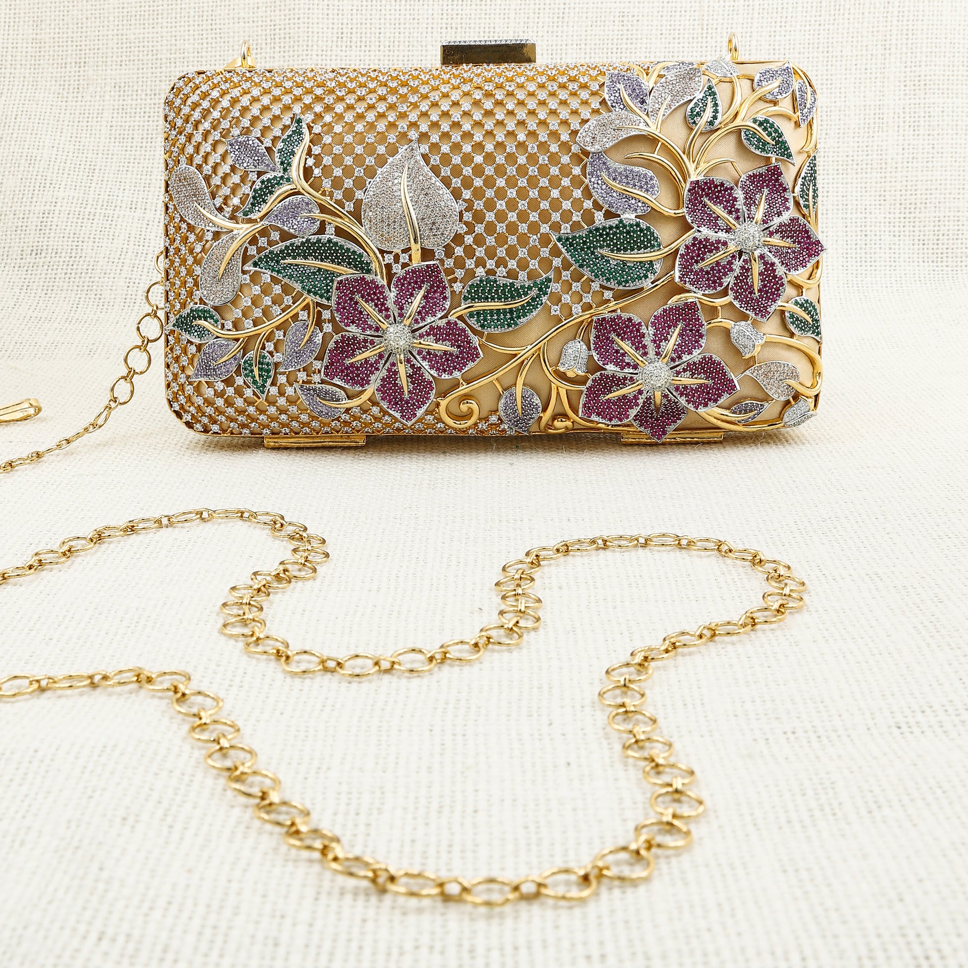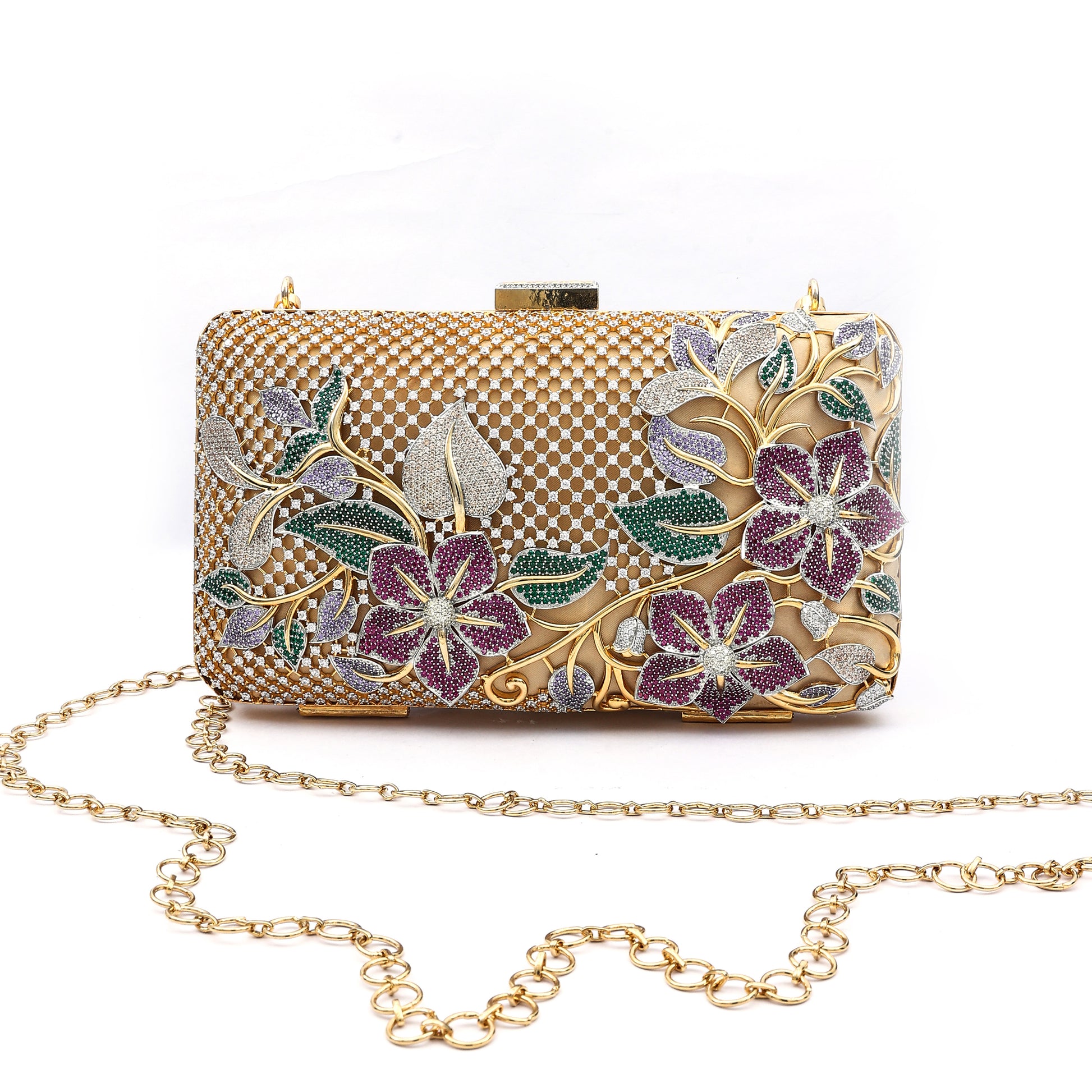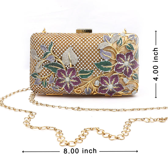 Make a statement with this luxurious gold-toned clutch, adorned with intricate floral detailing in sparkling hues of purple, green, and silver. Designed with a fine mesh pattern and a delicate chain strap, this piece effortlessly blends elegance and functionality. Perfect for weddings, festive occasions, and evening parties, this clutch is the ultimate accessory to complement your stylish ensemble.
