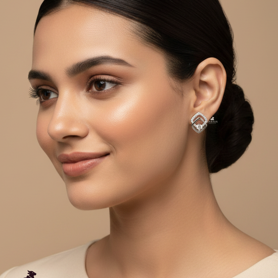 The TARAVA Geometric Sparkle Silver Stud Earrings feature a contemporary square-layered design accented with shimmering cubic zirconia. Clean lines combined with subtle sparkle create a refined and modern look, making these studs a perfect choice for everyday elegance as well as polished evening wear.