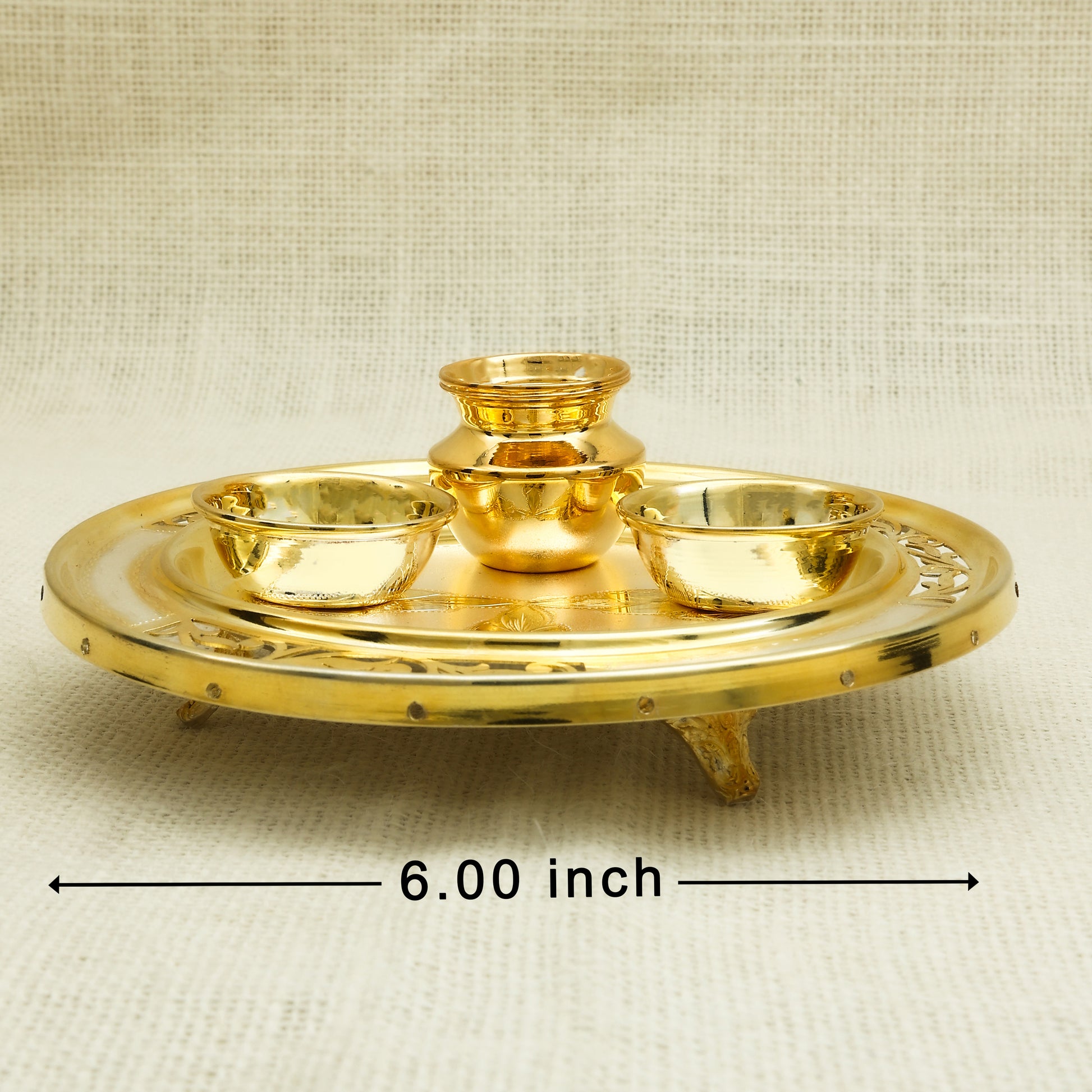 Add a regal touch to your décor with this exquisitely crafted silver gold-plated pooja thali set, featuring a beautifully polished finish and a traditional elevated design. The set includes a central kalash and two small bowls, ideal for holding kumkum, haldi, or sacred water during rituals. Perfectly balanced on ornate legs, this thali makes a meaningful addition to spiritual ceremonies and a thoughtful gift for housewarmings, weddings, or festive celebrations.