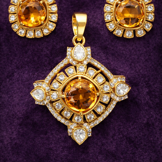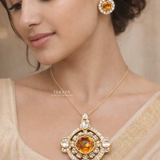 An eye-catching pendant set adorned with a warm amber-toned centerpiece framed by intricate polki and kundan work. The geometric layered design gives it a bold and festive character, while the matching stud earrings enhance the overall grandeur.