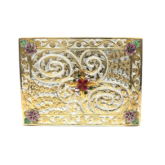 Handcrafted Gold & Silver Finish Decorative Box – Floral Enamel Accents (7.5 x 2 inch)