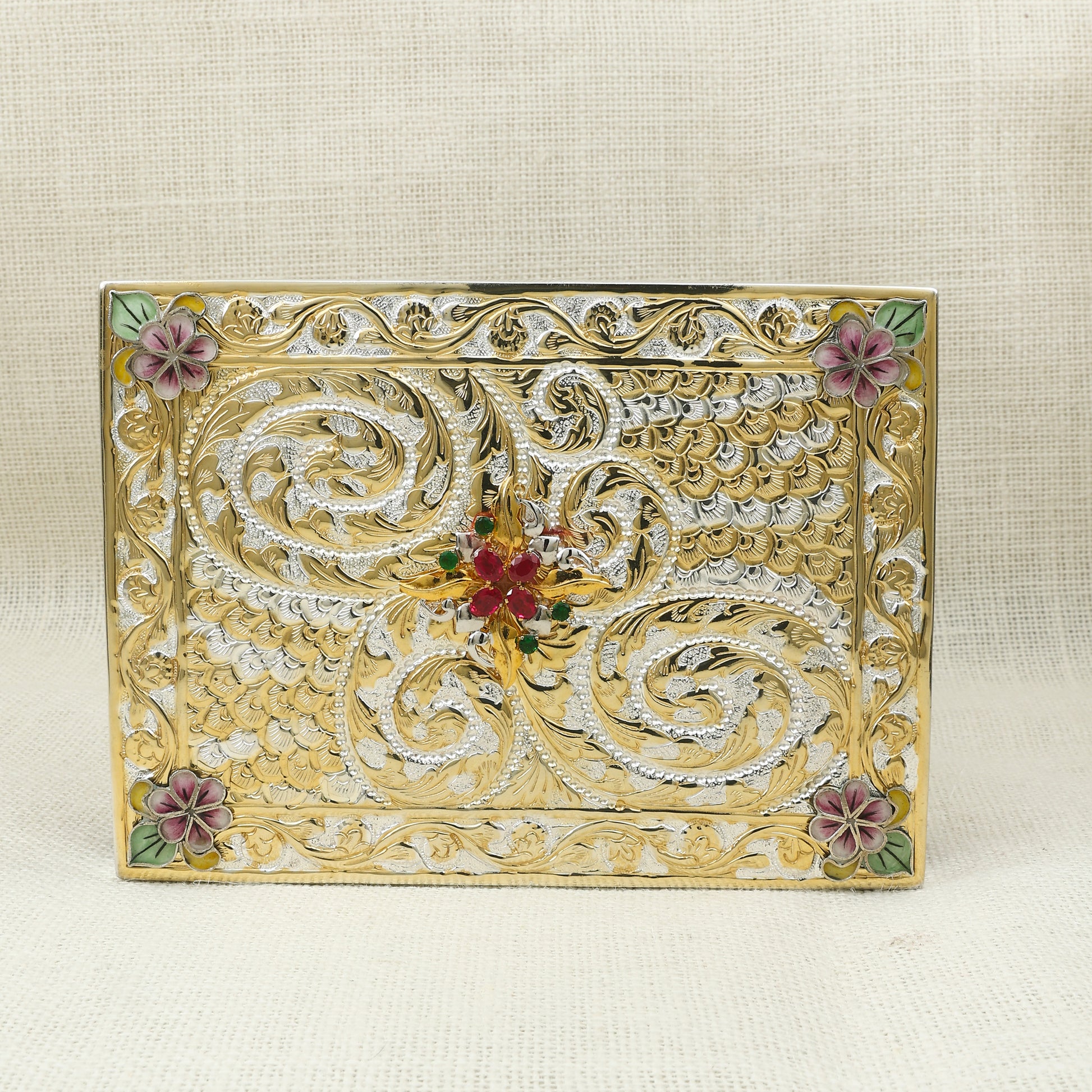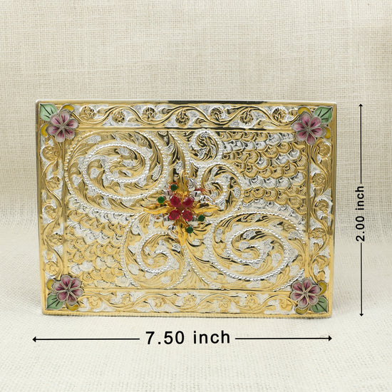 Add a vibrant touch of tradition to your space with this handcrafted decorative box featuring a stunning blend of silver and gold finishes. The surface is adorned with intricate embossed patterns and accented with colorful enamel floral designs in the corners and center, giving it a rich and festive appeal. Measuring 7.5 inches wide and 2 inches high, this elegant box is perfect for storing jewelry, pooja items, or cherished keepsakes. A beautiful gift option for weddings, festivals, or housewarmings, this box effortlessly combines artistic detail with practical use.