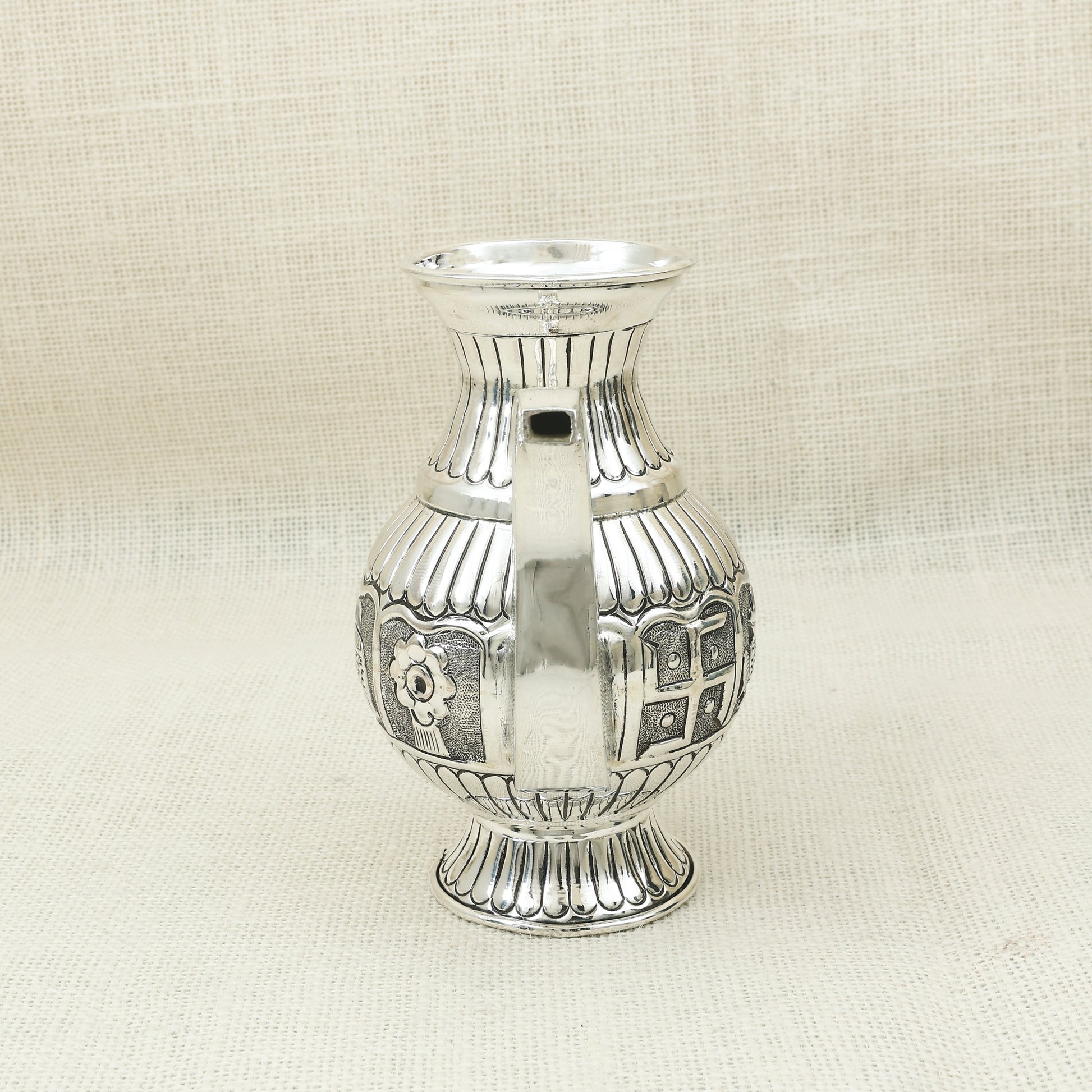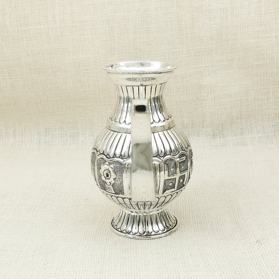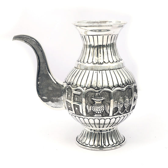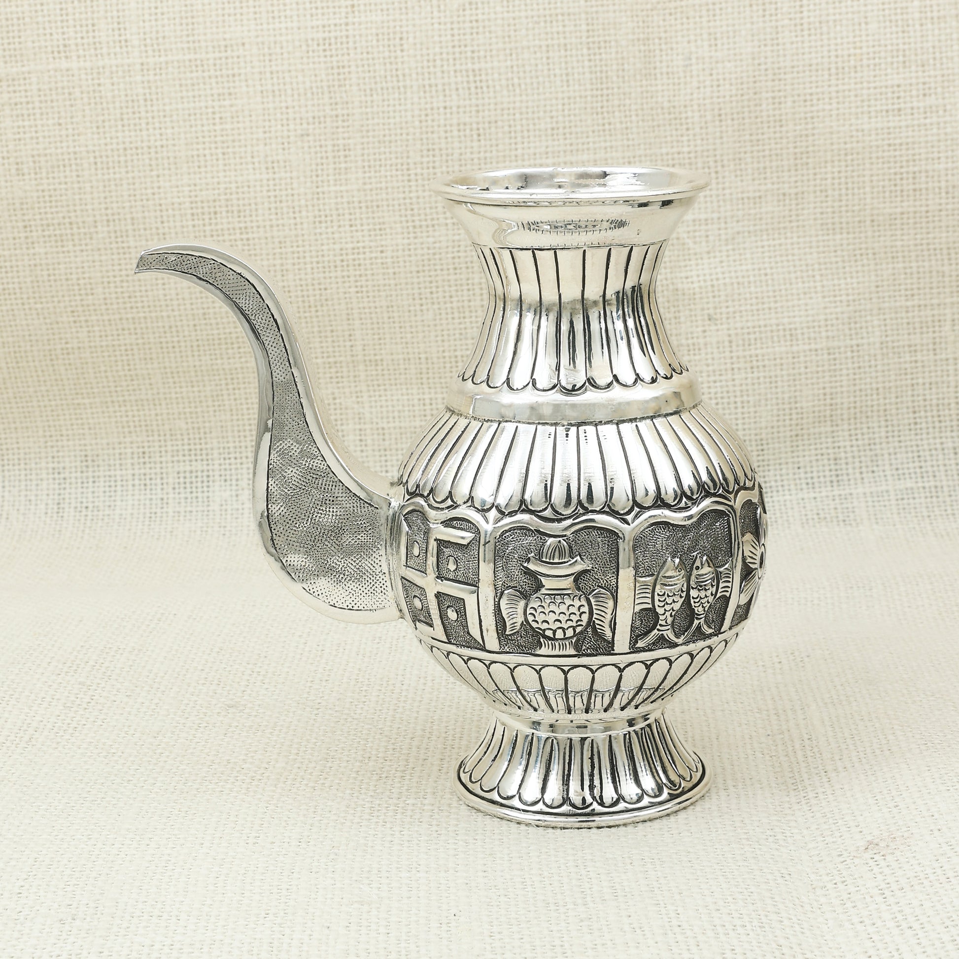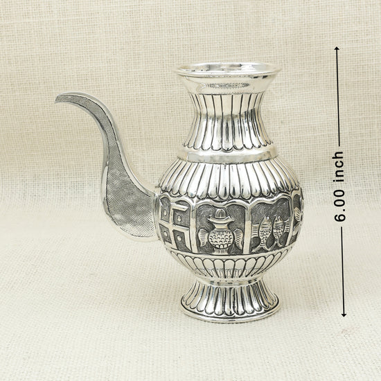 An exquisite 6-inch tall silver lota featuring a traditional curved spout and intricate embossed detailing inspired by temple art. This handcrafted piece is adorned with auspicious motifs such as kalash and diyas, symbolizing purity and devotion. The fluted neck and base enhance its elegance, making it a sacred addition to pooja rituals or a distinguished decor element. A thoughtful and timeless gift for religious ceremonies, weddings, or festive occasions.