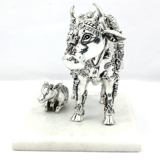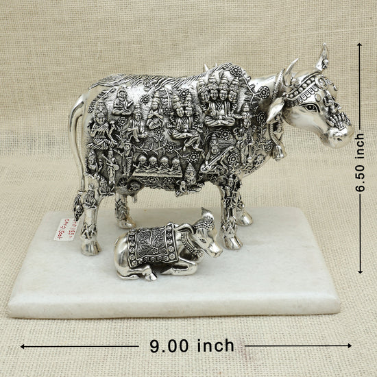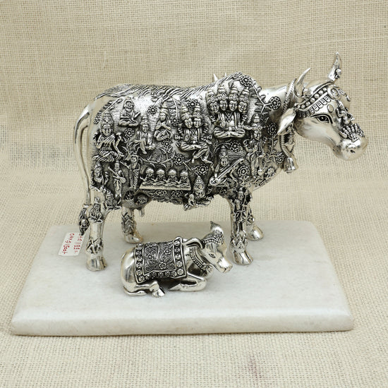Celebrate divine blessings with this intricately handcrafted silver Kamadhenu idol, artistically designed with miniature deities adorning her sacred form. Seated gracefully on a pristine marble base, this revered cow of plenty is accompanied by her calf, symbolizing fertility, nourishment, and spiritual wealth. A perfect addition to pooja rooms, temple décor, or sacred altars, this piece embodies Vedic tradition and devotional artistry. Ideal for gifting on religious occasions, housewarmings, or festivals, this Kamadhenu murti brings peace, prosperity, and sanctity into your space with timeless elegance.