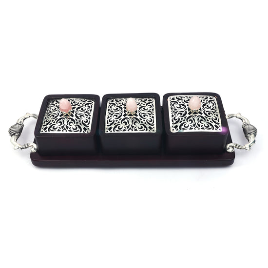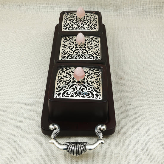Bring home a blend of elegance and utility with this handcrafted wooden bhand set, featuring three beautifully designed containers set on a matching tray. Each container is topped with an ornate silver-toned lid, delicately crafted with floral filigree patterns and finished with a rose quartz-style knob for added charm. The tray is accented with intricately designed handles shaped like traditional shankhs (conch shells), adding a cultural and artistic flair. Ideal for storing dry fruits, condiments, or mouth fresheners, this bhand set is perfect for festive serving, special gatherings, or as a thoughtful gift. Enhance your kitchen or dining décor with this timeless and functional piece.