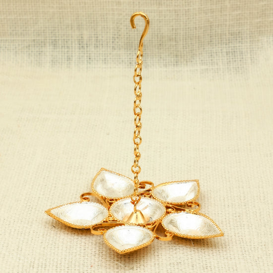 Elevate your festive décor with this elegant hanging lotus diya stand, featuring six delicately crafted diyas in a radiant gold and silver finish. Suspended by a decorative chain and hook, this piece is perfect for illuminating your home during Diwali, Navratri, or religious ceremonies. A beautiful blend of tradition and charm, ideal for gifting or enhancing your pooja space.