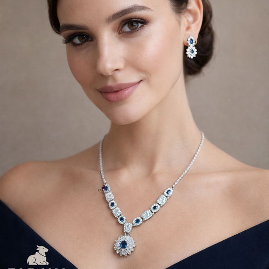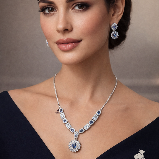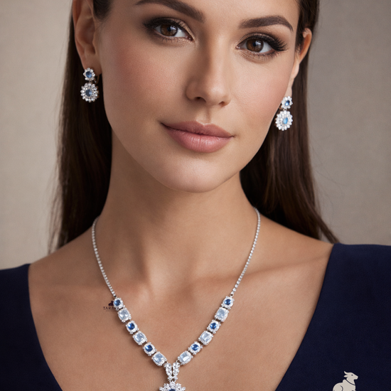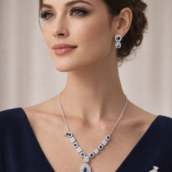 The TARAVA Imperial Sapphire Halo Silver Necklace showcases a graceful V-shaped arrangement of sparkling zircon stones leading to a regal halo pendant. The intricate stone setting and elegant symmetry give this necklace a luxurious, heirloom-inspired look, making it perfect for weddings, festive occasions, and statement evening wear.