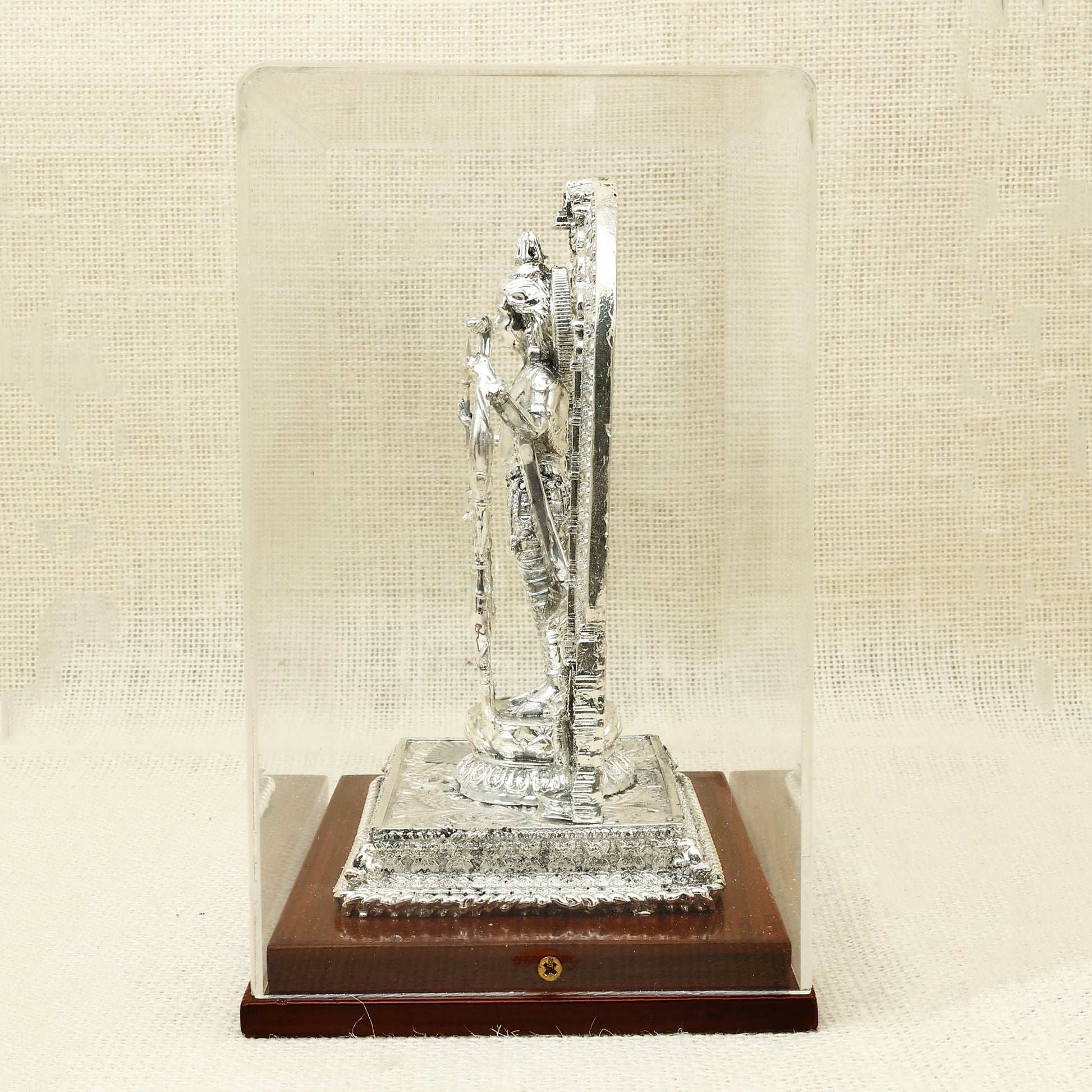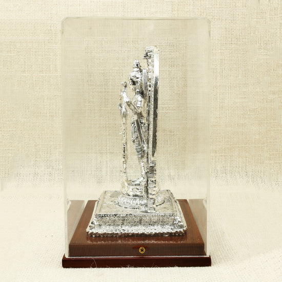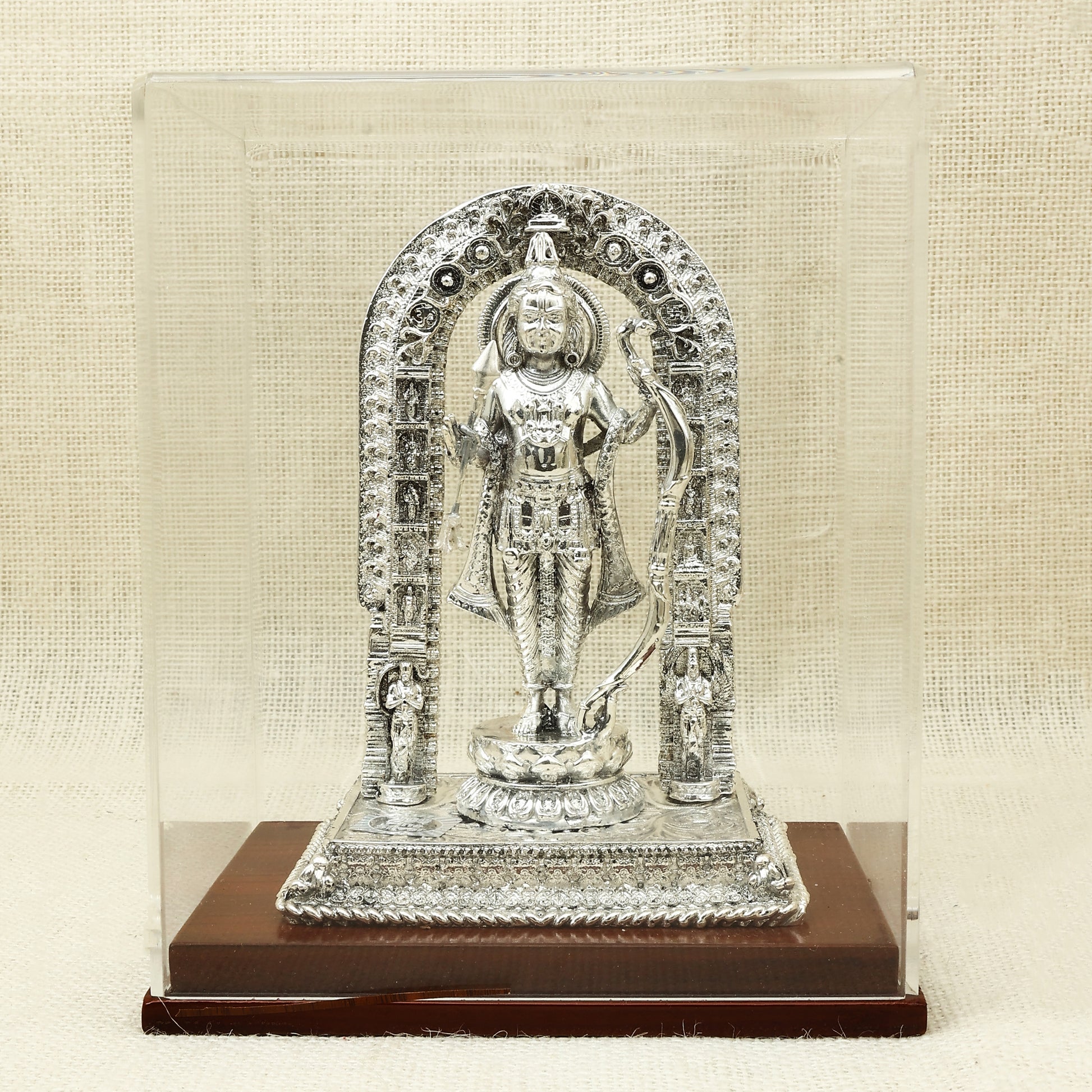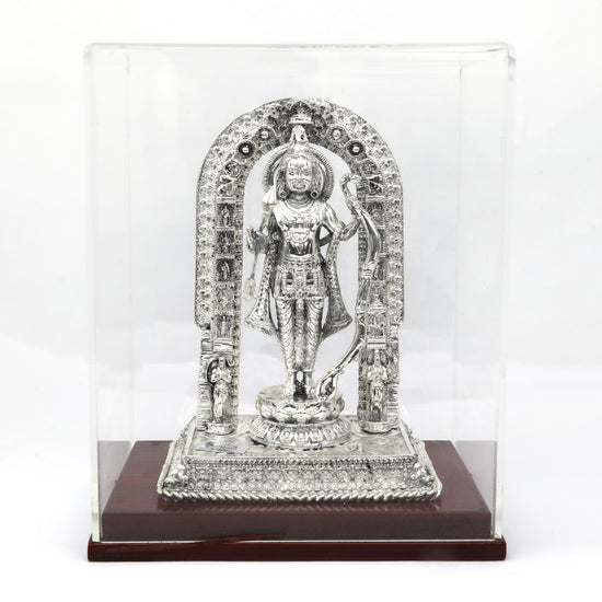 Intricately Crafted Silver Lord Ram Idol with Bow – Temple Arch Design in Glass Case
