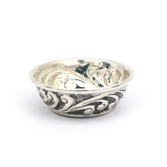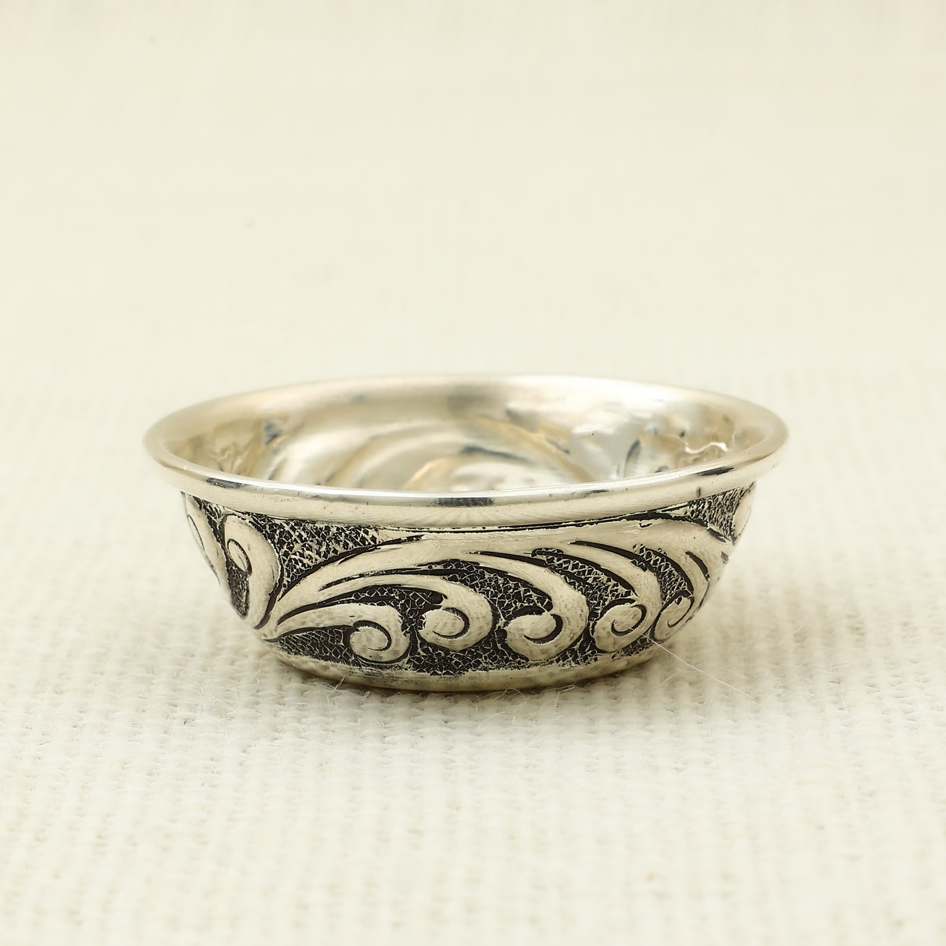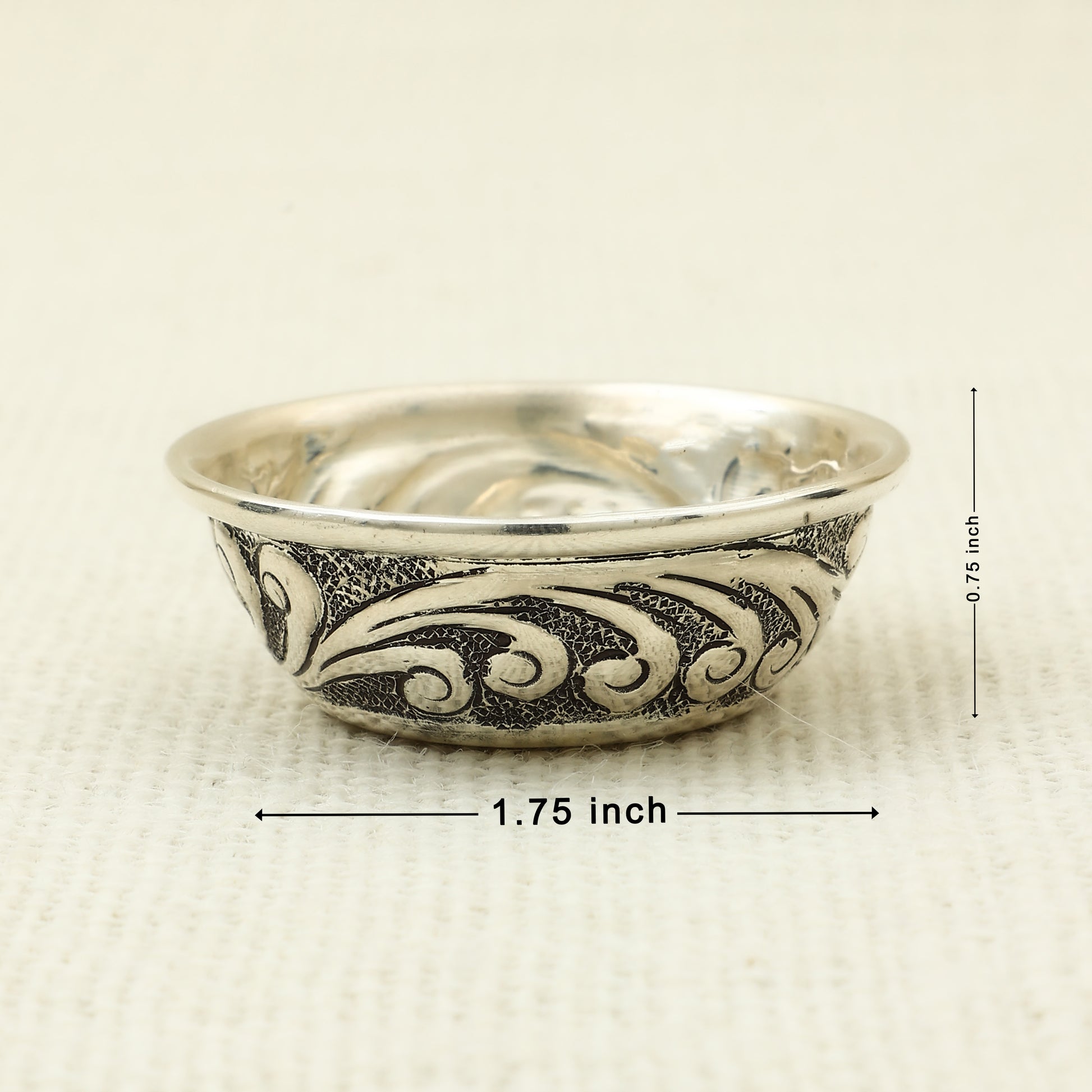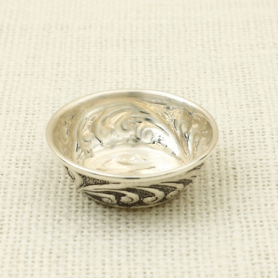 This finely crafted silver katori features a graceful vine pattern carved into its antique-finished surface, adding a regal touch to your dining or pooja setting. Compact yet elegant, it is ideal for serving condiments, sweets, or offerings. The contrast between the textured background and polished motifs enhances its vintage appeal. Whether used individually or as part of a set, this katori elevates every presentation with artisanal charm and timeless tradition.