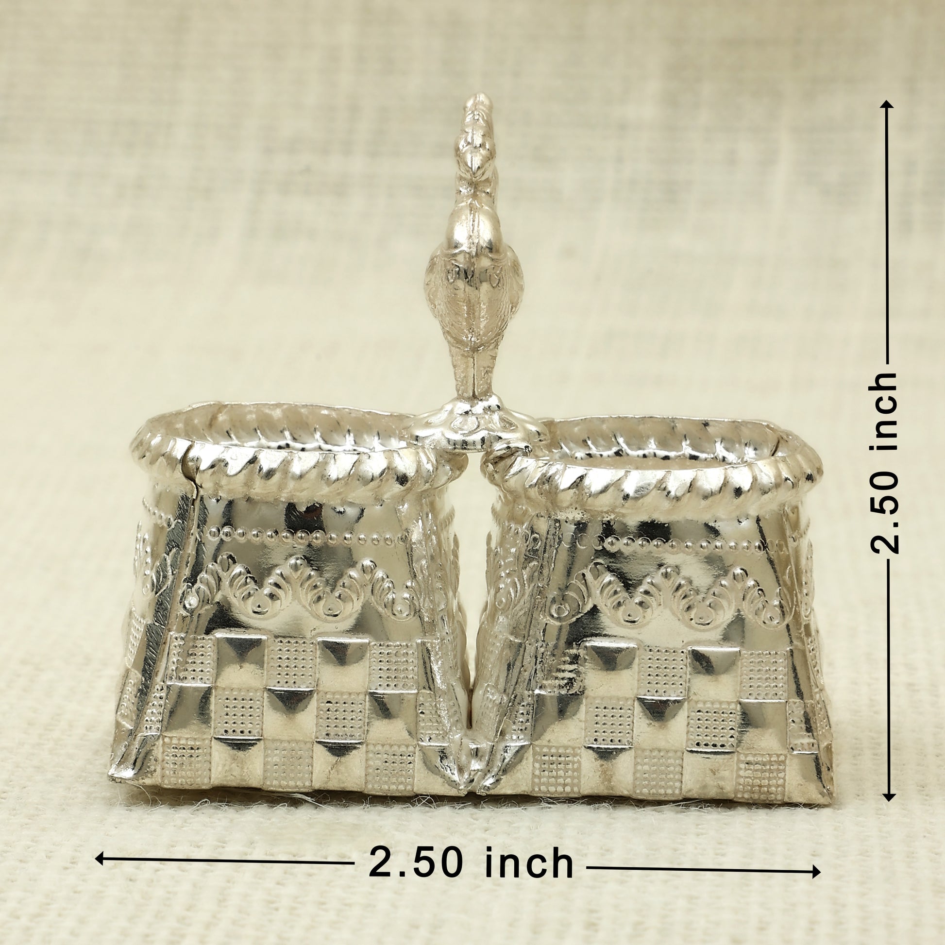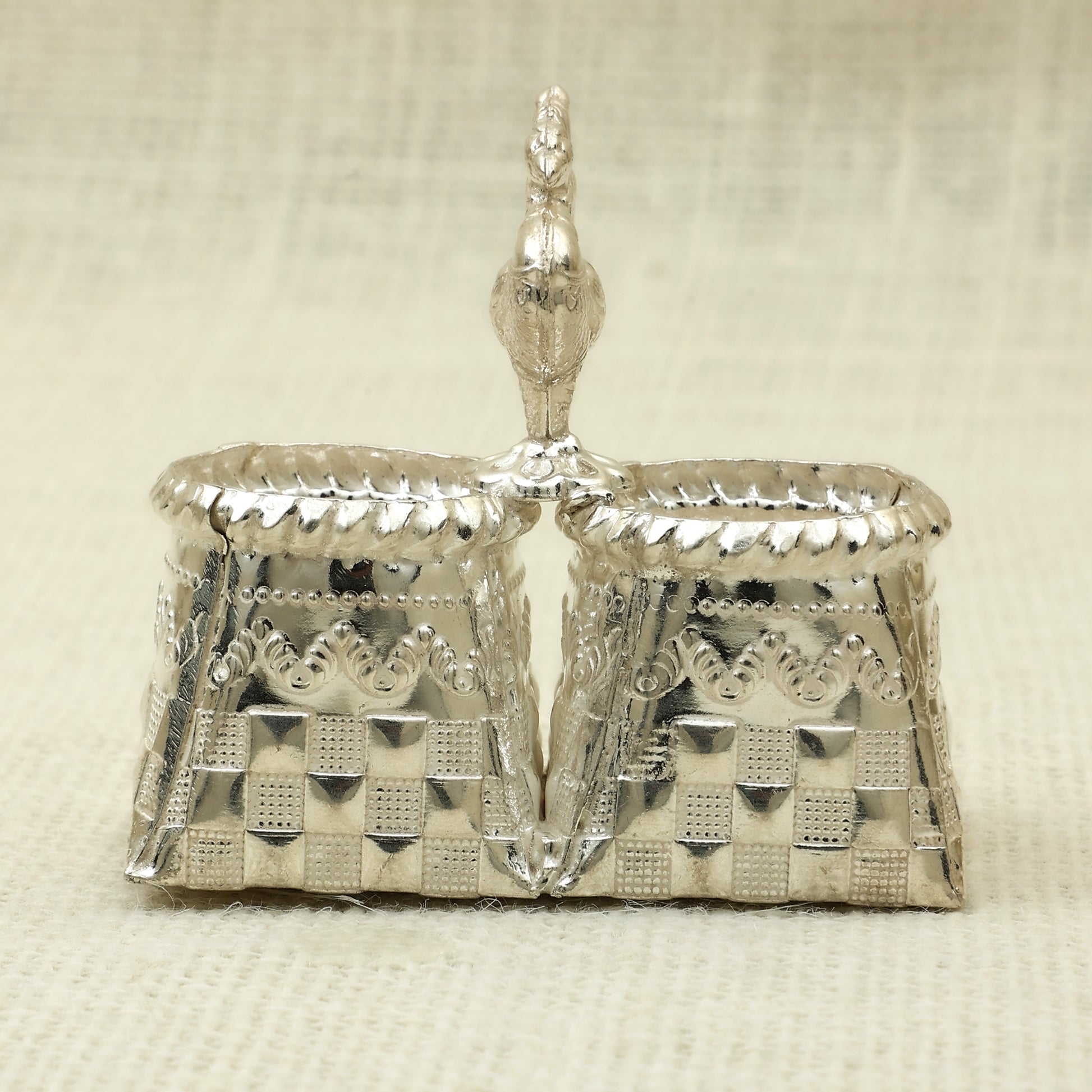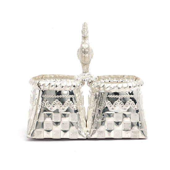 A regal handcrafted silver box crowned with a gracefully detailed peacock perched atop a scalloped lid. The base features intricate checkered and scrollwork patterns, blending traditional artistry with ornamental flair. Ideal for storing kumkum, haldi, or small keepsakes, this piece adds a royal touch to your pooja setup or home décor. A splendid choice for festive gifting and spiritual occasions.