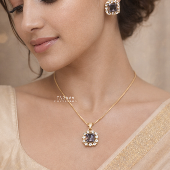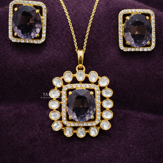 This elegant pendant set features a soft lavender-toned oval stone encased in a square polki halo frame. The border of radiant polki stones enhances its subtle sparkle, while the matching square studs add a modern charm. A perfect blend of minimal and statement design for refined occasions.