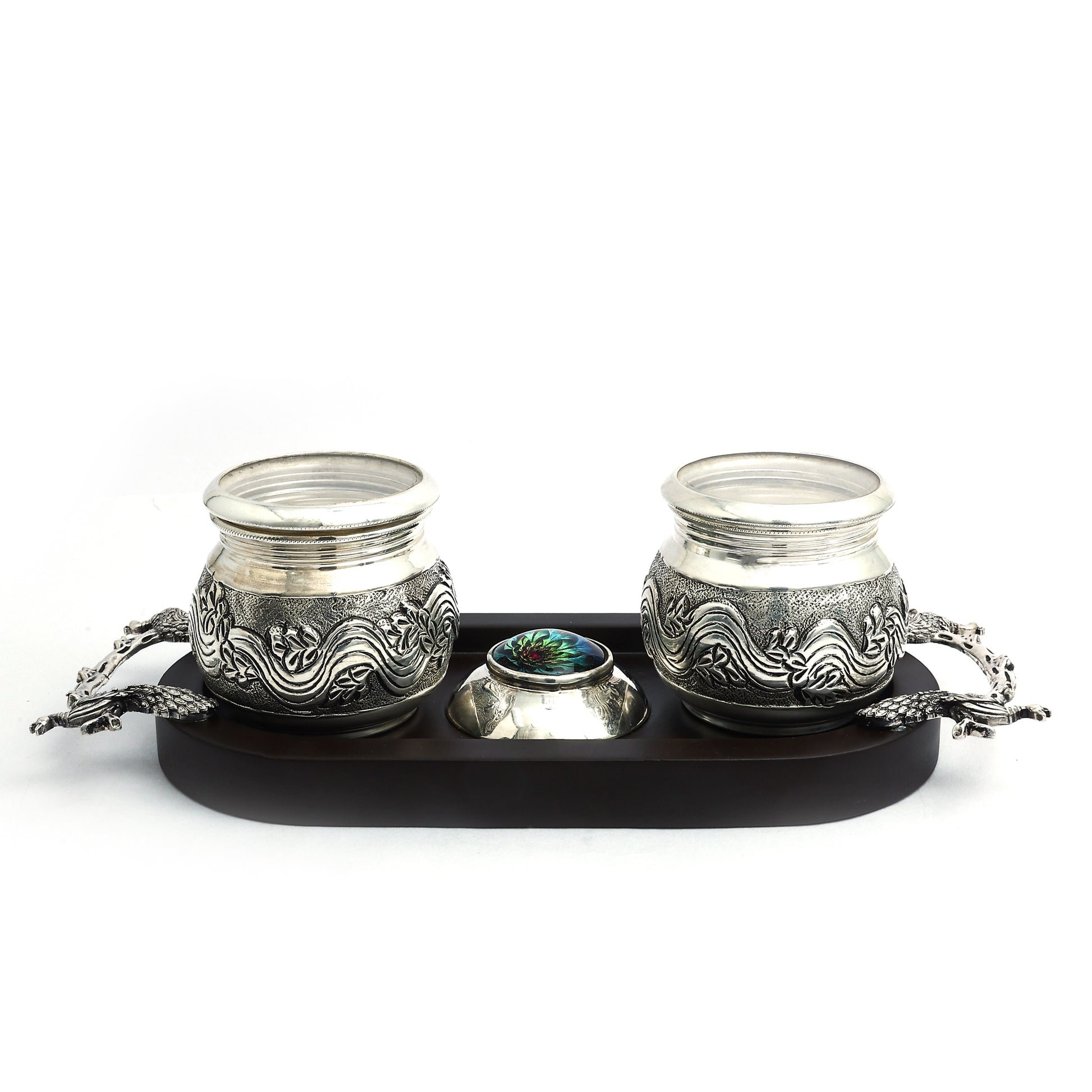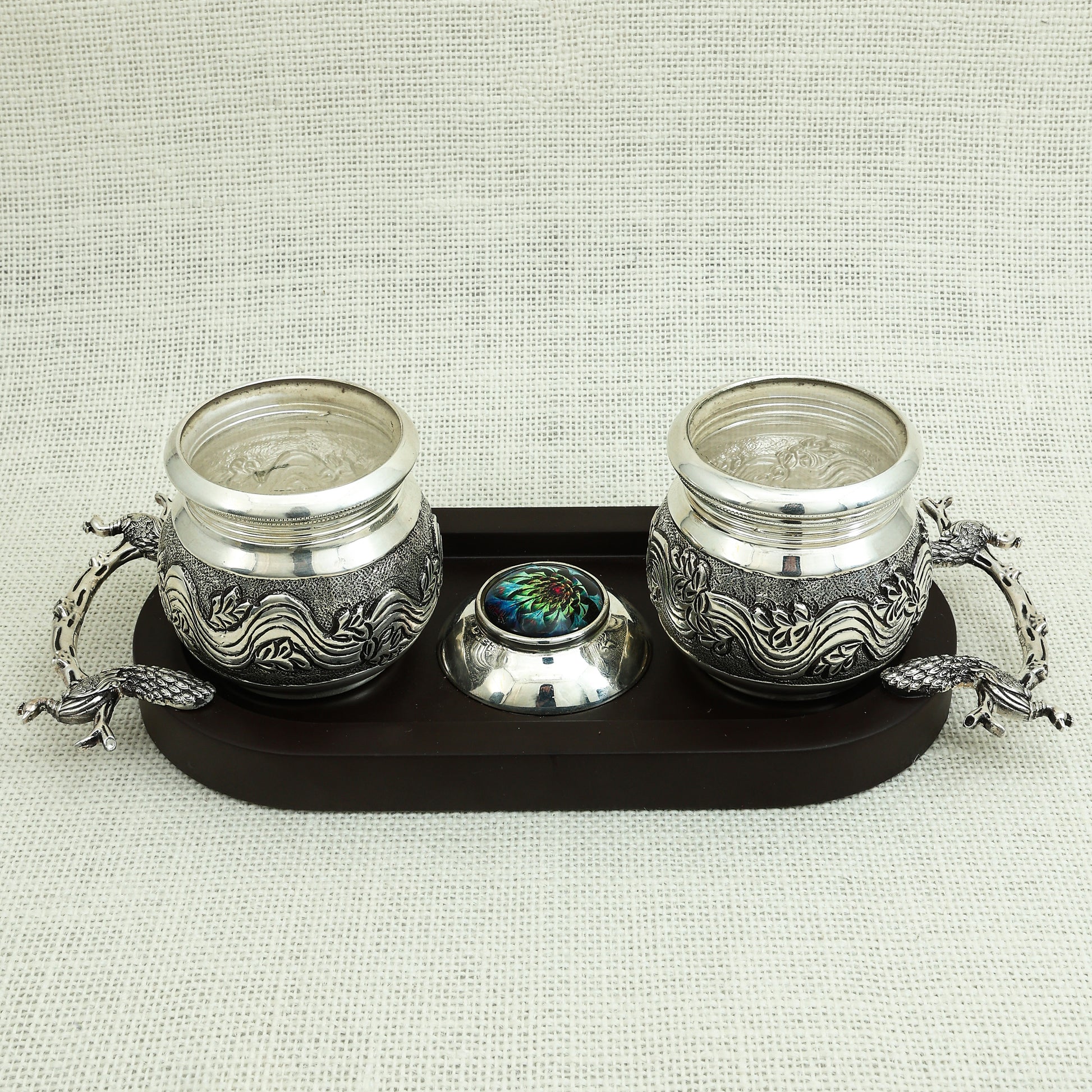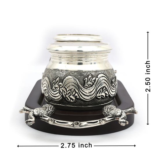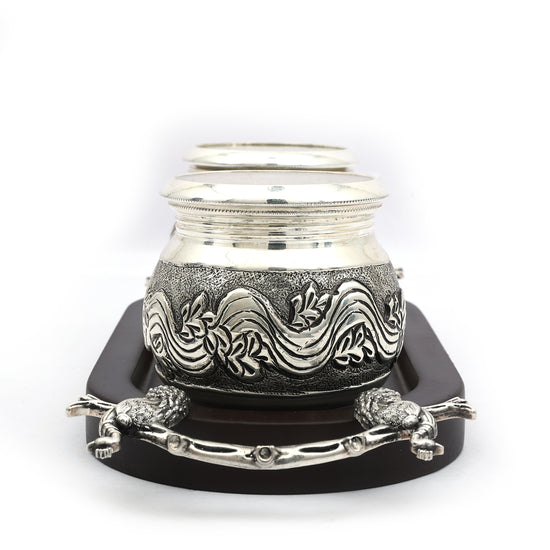 This exquisite silver-plated bowl set features intricate floral engravings, radiating timeless elegance and craftsmanship. The beautifully designed bowls rest on a sophisticated wooden tray with delicate animal-shaped feet, complemented by a graceful crane figurine centerpiece. Ideal for serving dry fruits, sweets, or as a luxurious gift, this set adds a touch of tradition and charm to any occasion.