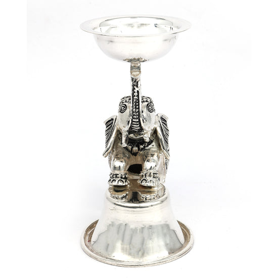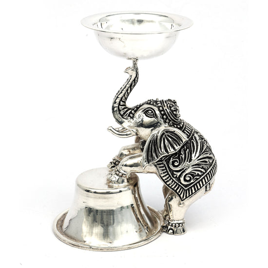 Bring divine blessings and elegance to your home with this beautifully crafted Silver Elephant Diya. Featuring a regal elephant with its trunk gracefully supporting the diya, this piece symbolizes wisdom, strength, and prosperity. The intricate detailing and polished silver finish make it a stunning addition to pooja rooms, temples, and festive decorations. Perfect for daily rituals, special ceremonies, or as a thoughtful gift for spiritual occasions, this diya illuminates your prayers with grace and grandeur. Add this timeless piece to your collection and invite positivity into your space.