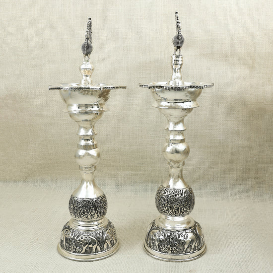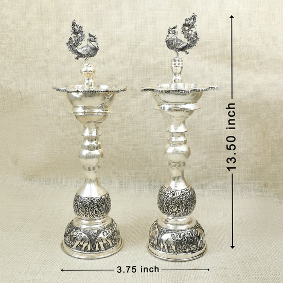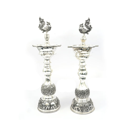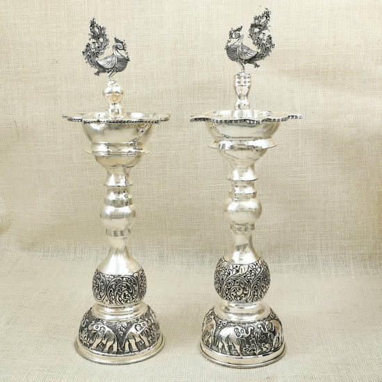 Elevate your traditional decor with this stunning Mayur Samay silver lamp pair. Each piece features an intricately carved peacock finial and finely detailed body with traditional elephant and floral motifs around the base. Crafted to reflect divine elegance, these tall standing lamps are perfect for pooja rooms, festive occasions, or as a heritage gift set. The two-piece set enhances the spiritual ambience of your home while showcasing fine craftsmanship. A timeless symbol of light, culture, and artistry.