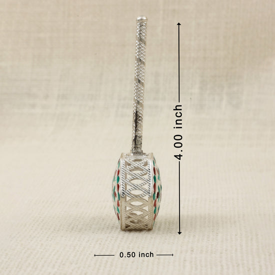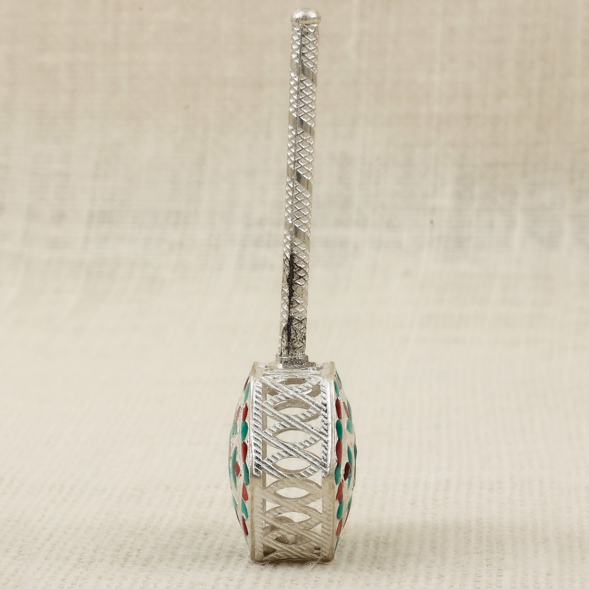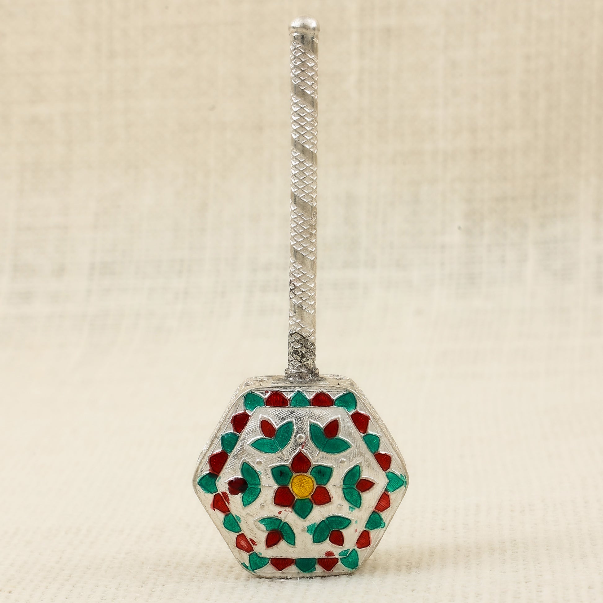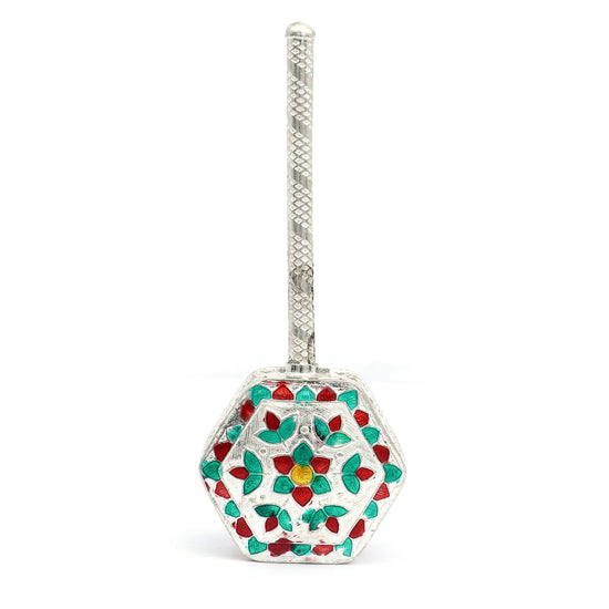 Crafted in pure silver, this Meena Work Junjuna (traditional baby rattle) showcases intricate handwork with colorful red, green, and yellow enamel floral designs. Its hexagonal base and textured handle add elegance to its authentic form. Traditionally used in baby showers, naming ceremonies, and as a spiritual offering during pooja rituals, this rattle symbolizes blessings and prosperity. A perfect blend of culture and craftsmanship, ideal for gifting or spiritual collections.