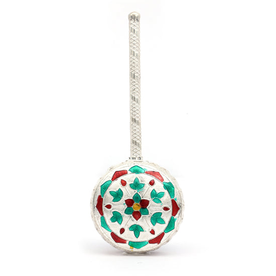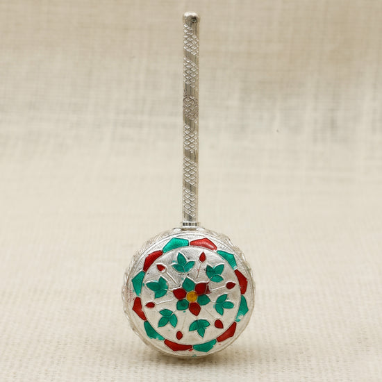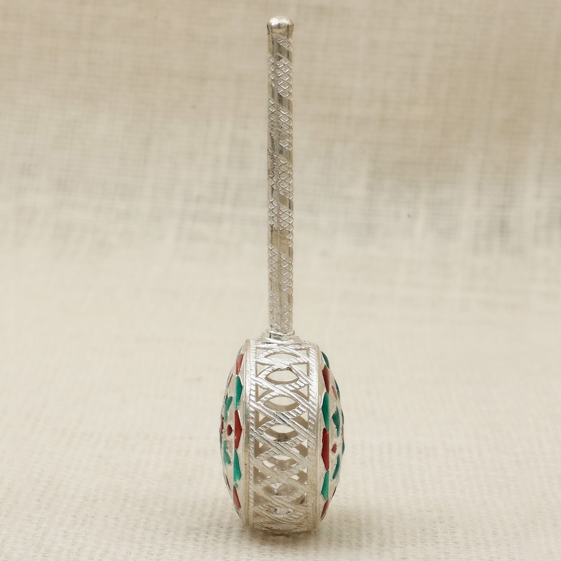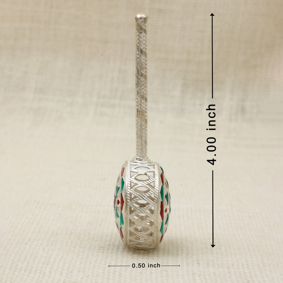This exquisite pure silver Meena Work Junjuna features vibrant red, green, and yellow enamel floral motifs on a hexagonal base, combined with a finely textured handle. Renowned for its cultural and spiritual significance, this traditional baby rattle is perfect for ceremonial occasions like baby showers, naming ceremonies, and religious rituals. Handcrafted with precision, it embodies timeless heritage and is an ideal gift symbolizing blessings, prosperity, and tradition.