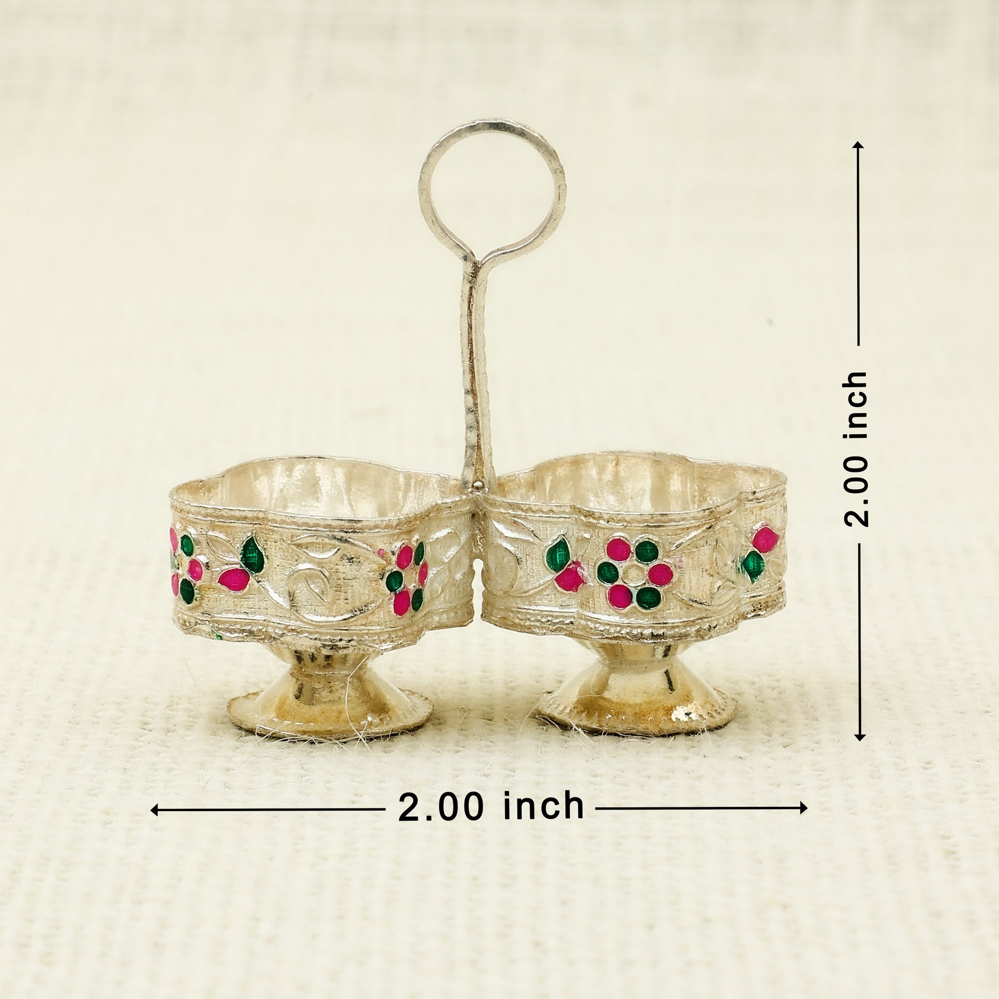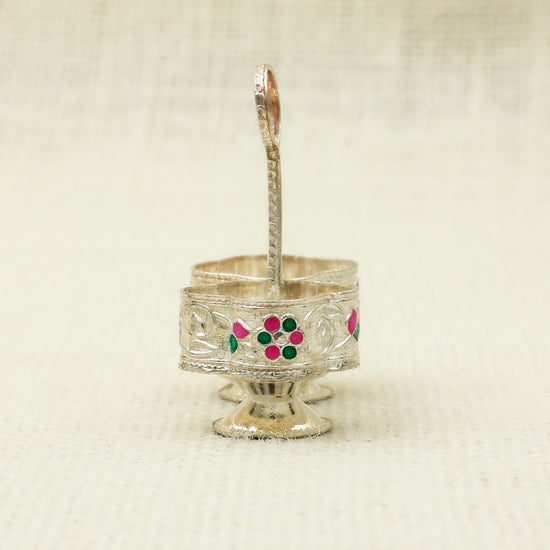 Add a splash of tradition and color to your pooja rituals with this Meenakari silver Kankavati, designed with two delicately embossed bowls joined by a central handle for easy carrying. Decorated with vibrant pink and green floral enamel work, this elegant piece is ideal for holding kumkum and haldi during religious ceremonies, festivals, or auspicious events. Its petite design and artistic detail make it a charming addition to any mandir setup or a thoughtful gift for loved ones.